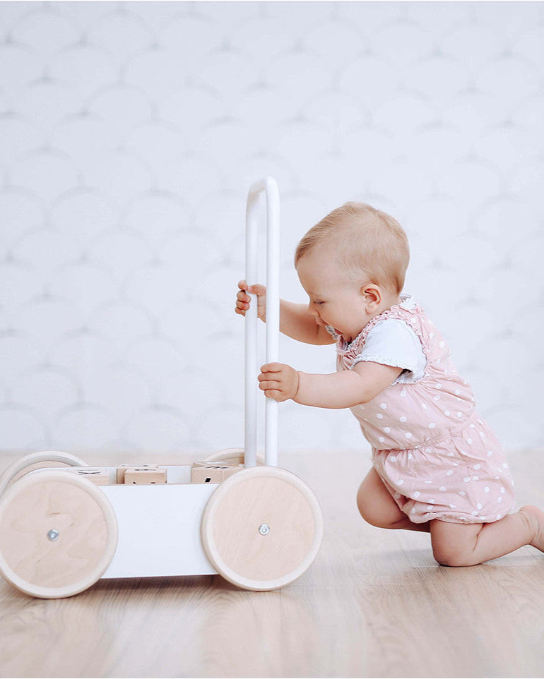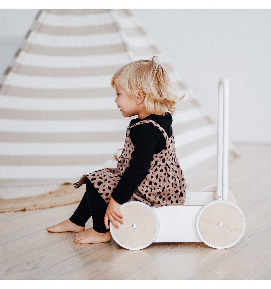 Zugleich wird der Wagen schnell zum Lieblingsspielzeug – denn er eignet sich auch perfekt als Transportfahrzeug für Puppen, Kuscheltiere oder Bausteine. Mit seiner klaren, skandinavisch inspirierten Optik fügt er sich nahtlos in moderne Wohnräume ein und wird zu einem echten Hingucker, der nicht wie ein klassisches Babyprodukt wirkt.