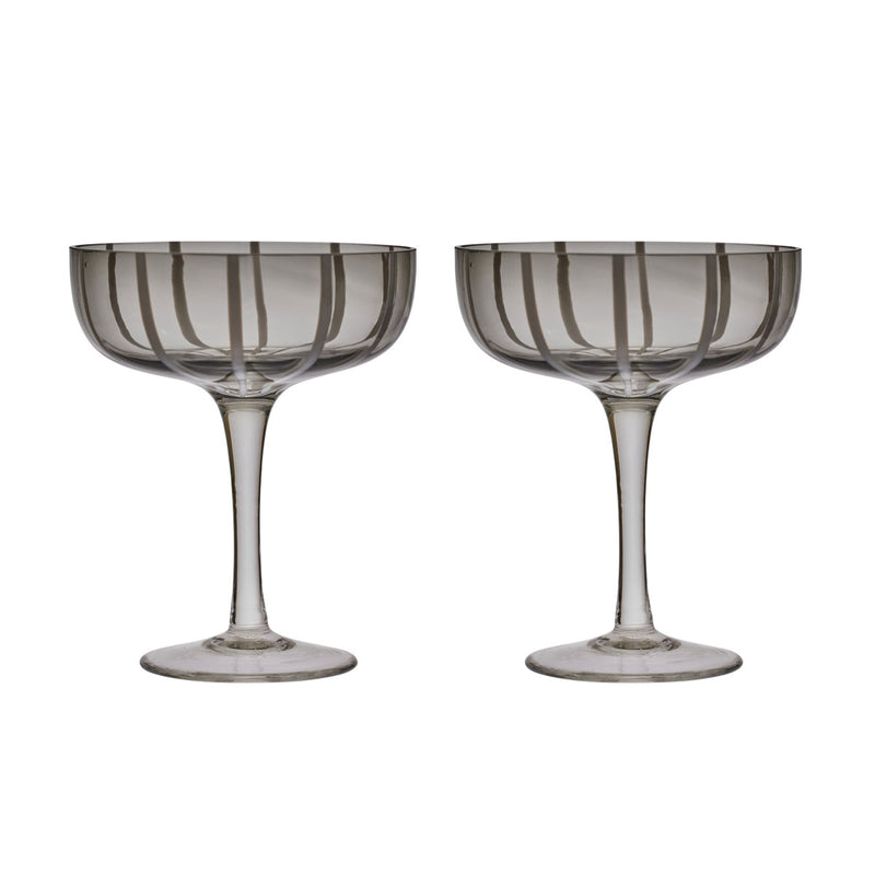 Serve your loved ones their favorite cocktail, ice-cream dessert or champagne in the striped, grey coupe glass from OYOY. The Mizu series is characterized by an elegant, light and modern expression - which catches everyone's attention. The coupe glass is designed with an elegant and long neck, which is combined with the large and open bowl. Each glass is unique as it is mouth blown, and with handmade details. The Mizu Coupe Glass comes in a set of two.The glass has a volume of 230 ml.Dishwasher safe.Style no. L300549 Color: Grey Material: 100% Glass Dimensions: Ø11,5 x H14 cm Suitable for dishwasher and microwave. For more information on food contact material and declarations on conformity, please use this link: https://oyoy.presscloud.com/digitalshowroom/#/gallery/Compliance(You can search a specific item by entering the item number in the top right search field)