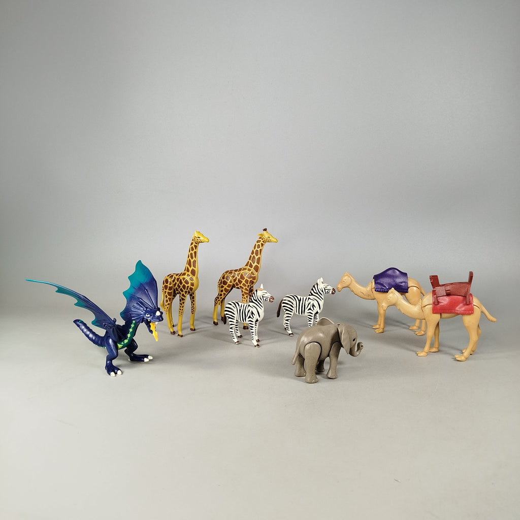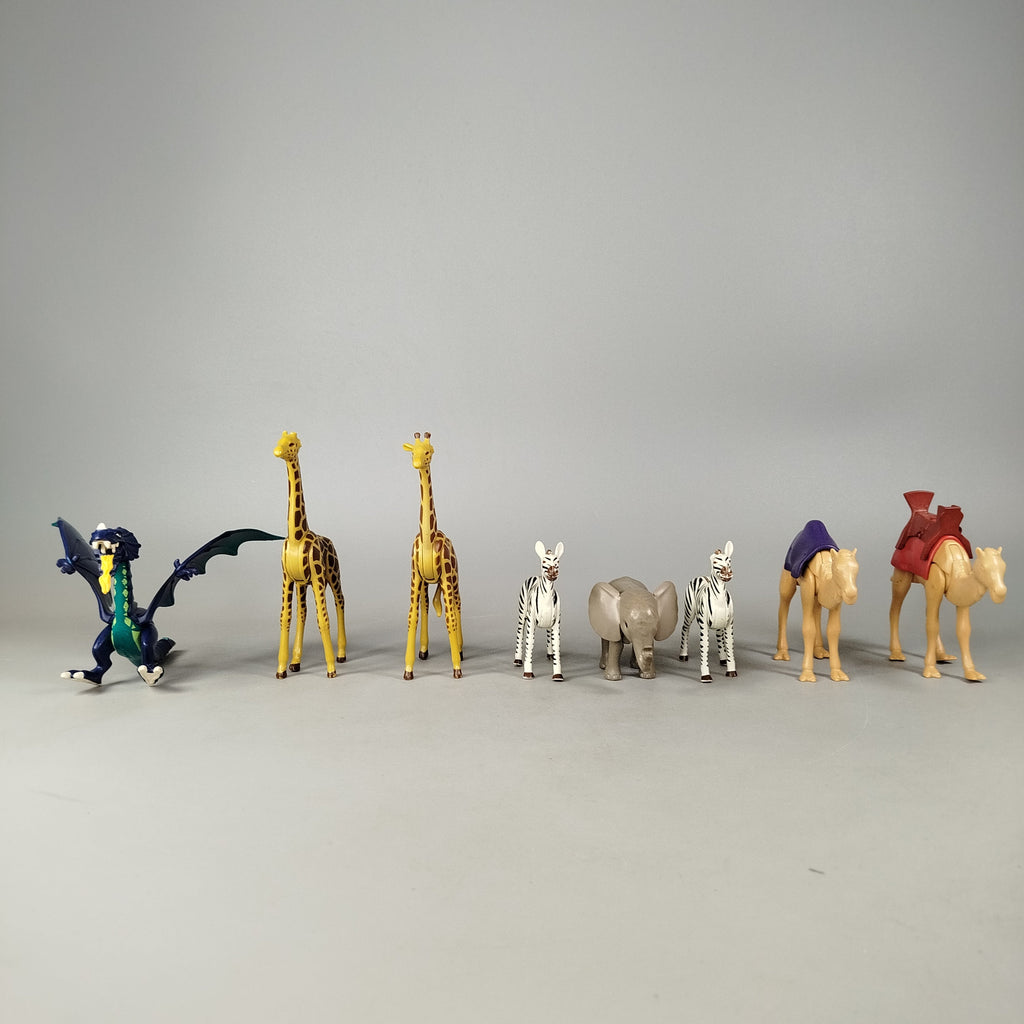 Hol dir das Playmobil Tierfiguren-Set mit insgesamt 8 Figuren, darunter Giraffen, Zebras, Elefant, zwei Kamele mit abnehmbaren Sätteln und ein Drache mit Flügeln. Einige Figuren zeigen Gebrauchsspuren, eine Giraffe und ein Zebra haben beschädigte Ohren. Verpackung fehlt. Das Spielzeug befindet sich in gutem gebrauchten Zustand. Gib diesen Figuren ein neues Zuhause und bring Fantasie ins Kinderzimmer! Sicherheitshinweis: Nicht für Kinder unter 3 Jahren geeignet, da Kleinteile verschluckt werden können.
