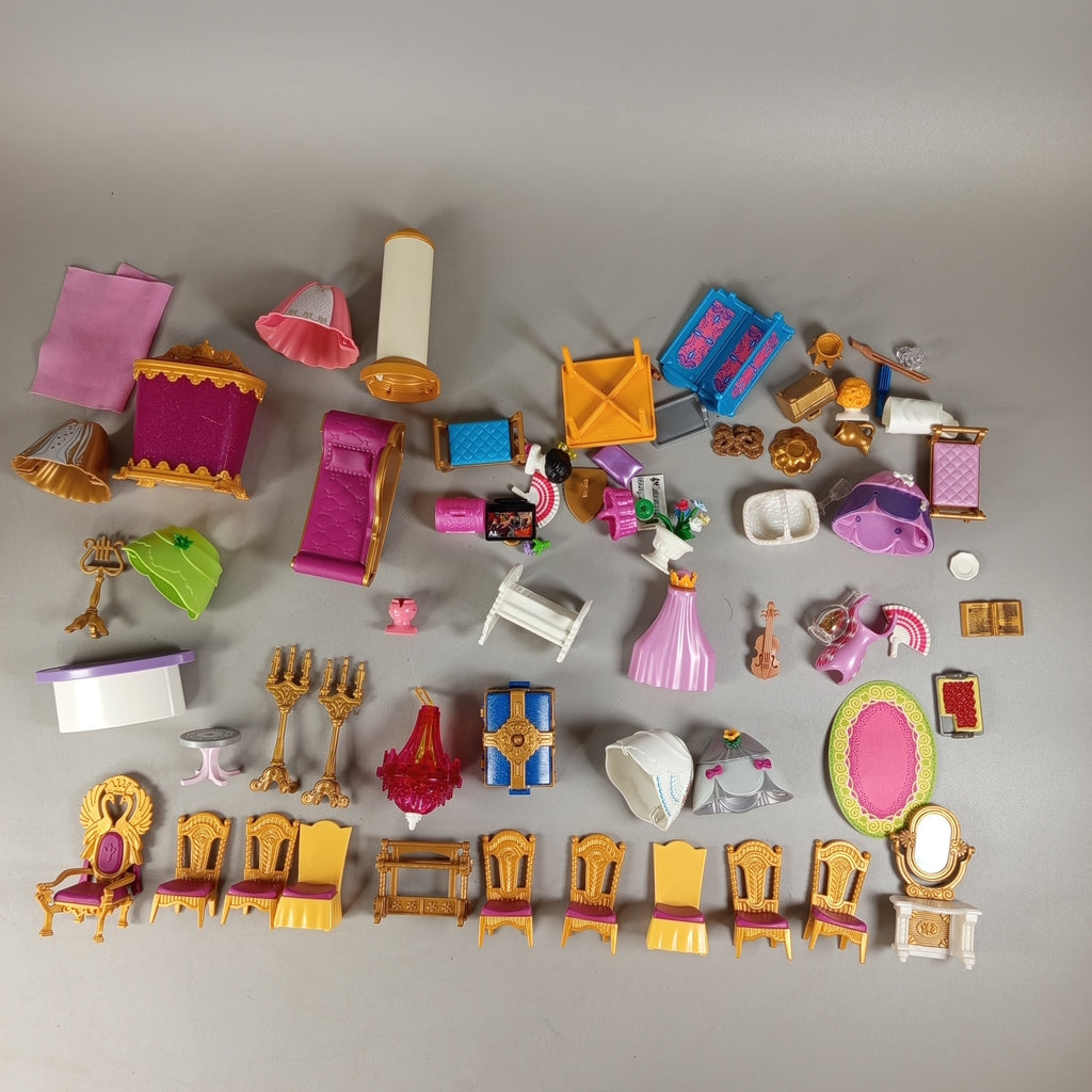 Hol dir das Playmobil Schloss-Set mit 29 Figuren, Pferden und Fantasietieren für kreative Rollenspiele. Das große Set enthält Gebäudeteile, Möbel wie Betten, Tische, Stühle, Schränke sowie viele Accessoires wie Kerzenständer, Kronleuchter, Geige und Spiegel. Das Spielzeug zeigt leichte Gebrauchsspuren, ist aber gut erhalten. Verpackung und Anleitung fehlen, die Vollständigkeit konnte nicht überprüft werden. Hinweis: Enthält Kleinteile, nicht geeignet für Kinder unter 3 Jahren.