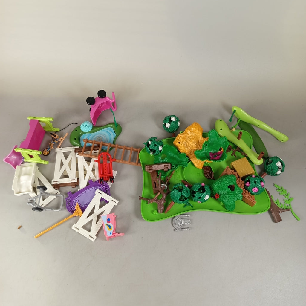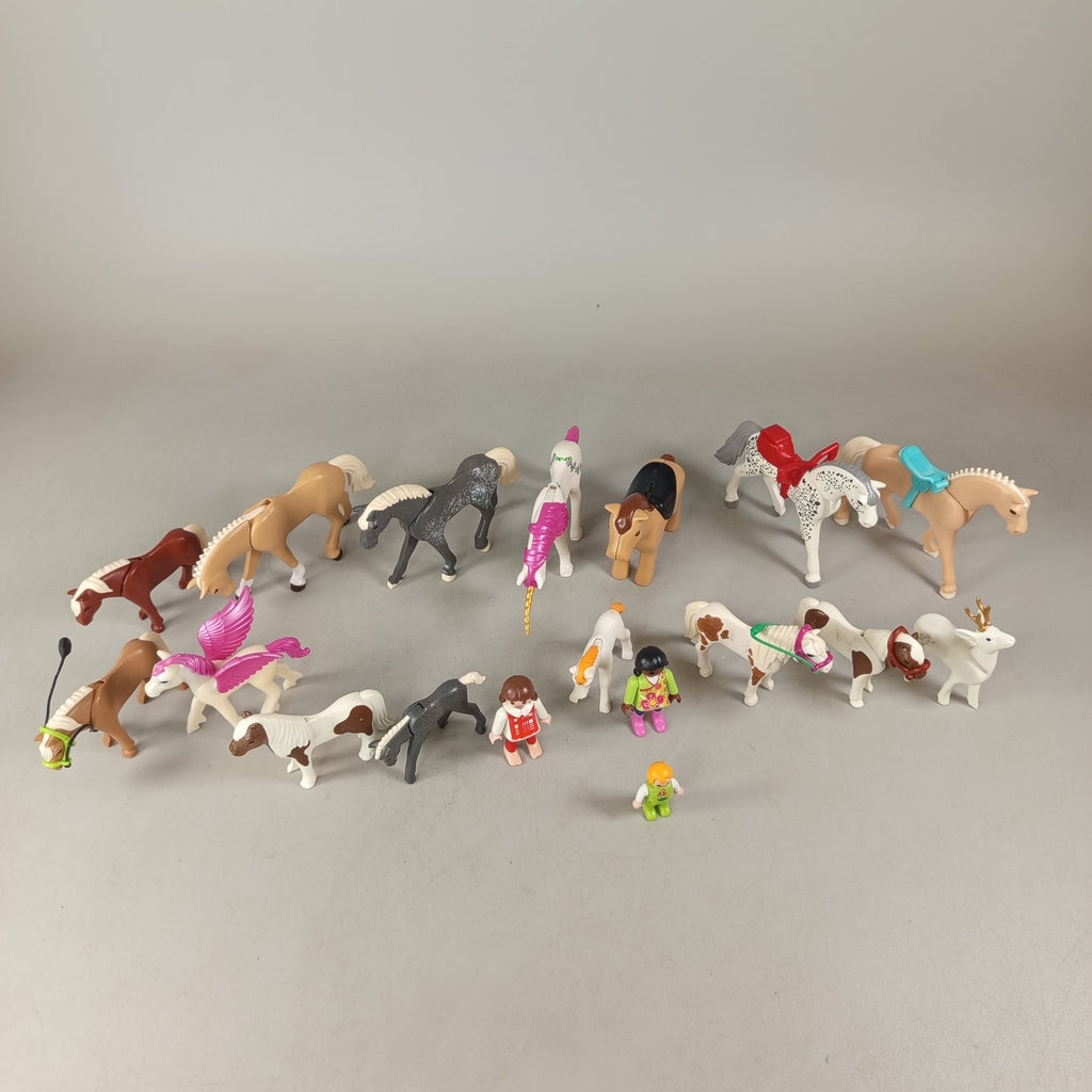 Hol dir das Playmobil Figuren-Set mit 18 liebevoll gestalteten Figuren und Zubehör für fantasievolle Abenteuer. Enthalten sind Tiere wie Pferde und ein Hirsch, menschliche Figuren, Zäune, ein Wagen, Bäume und eine Geländeplatte. Ein Pferd besitzt sogar Flügel für besondere Spielmomente. Das Set ist befindet sich in einem sehr guten gebrauchten Zustand. Gib diesem Spielzeug ein neues Zuhause und fördere kreatives Spielen. Hinweis: Nicht geeignet für Kinder unter 3 Jahren wegen verschluckbarer Kleinteile.