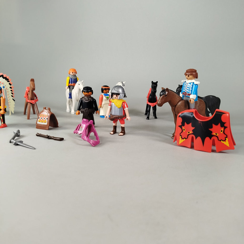 Hol dir das Playmobil Figuren-Set mit 8 menschlichen Figuren und 7 Tieren, darunter 6 Pferde und 1 Lama. Enthalten sind zudem Zubehörteile wie Speere, ein Gewehr, ein Schwert sowie Sattel- und Pferdeausstattungen. Perfekt für kreative Rollenspiele und Abenteuer im Kinderzimmer. Das gebrauchte Set befindet sich in einem sehr guten Zustand, die Verpackung ist nicht mehr vorhanden. Gib diesen Figuren ein neues Zuhause und fördere nachhaltiges Spielen. Hinweis: Nicht für Kinder unter 3 Jahren geeignet, da Kleinteile verschluckt werden können.
