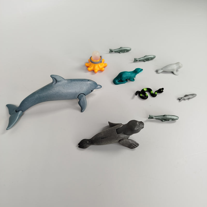 Tauche mit diesem Playmobil Meeres- und Flusstiere-Set in spannende Unterwasserabenteuer ein! Das Set umfasst eine Vielzahl von Wassertieren, darunter einen Delfin, eine Robbe, Fische, einen Oktopus und einen Otter. Diese detailgetreuen Figuren sind perfekt für Rollenspiele in einem Ozeanarium, einer Flusslandschaft oder bei Rettungsmissionen im Meer. Sie bieten zahlreiche Spielmöglichkeiten und lassen sich mit anderen Playmobil-Sets kombinieren, um eine faszinierende Unterwasserwelt zu gestalten.Gefertigt aus robustem Kunststoff, sind die Figuren langlebig und ideal für Kinder ab 4 Jahren geeignet. Das Set fördert kreatives Spielen und regt die Fantasie an, während die Kinder mehr über die faszinierende Welt der Meeres- und Flusstiere lernen.Eigenschaften:Altersempfehlung: Ab 4 JahrenZustand: Sehr gut erhaltenVerschiedene Wassertiere: Delfin, Robben, Oktopus, Fische, Otter und mehrPerfekt für Unterwasserabenteuer und TierrollenspieleMit diesem Meeres- und Flusstiere-Set können Kinder ihre eigene Unterwasserwelt erschaffen und stundenlangen Spielspaß genießen. Perfekt für kleine Entdecker und Tierliebhaber!
