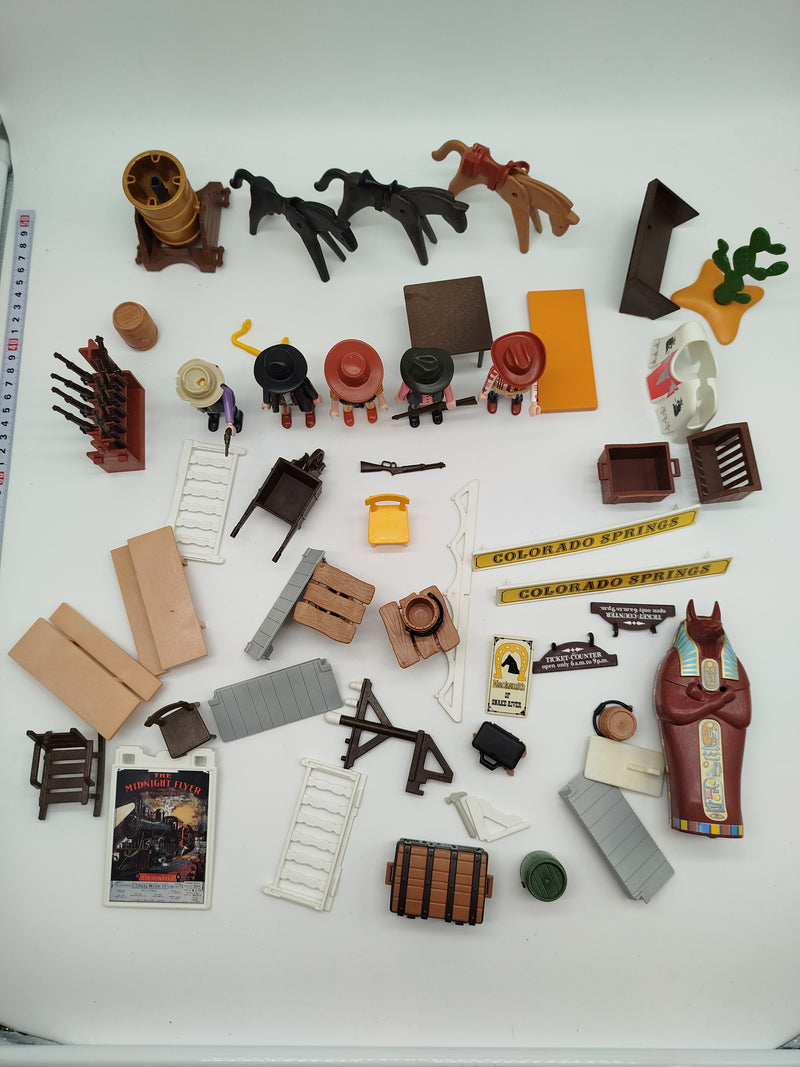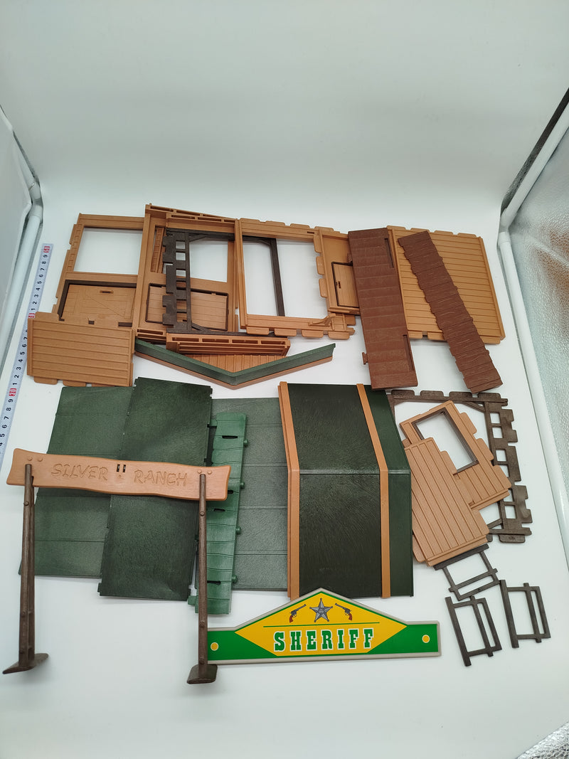 Dieses zusammengestellte Western Set enthält 2 Gebäude, eins mit Strohdach, ein transportables, wovon die Vorderseite eine Bank und die Rückseite eine Zelle darstellt (4398) sowie diverse Bauteile eines dritten Gebäudes. Des Weiteren beinhaltet das Set 19 Figuren, 2 Kutschen, Pferde, Möbel, Geldsäcke, Waffen und weitere Accessoires. Perfekt für Kinder ab 4 Jahren, die Fantasiewelten erschaffen wollen. Das Set ist in einem sehr guten gebrauchten Zustand, die leichte Abnutzung der Komponenten zeigt, mit diesen Spielsachen wurde gerne gespielt und kommt ohne Originalverpackung oder Anleitung. Gib diesem Spielzeug ein neues Zuhause und unterstütze die Wiederverwendung von Spielwaren. Hinweis: Enthält Kleinteile, nicht geeignet für Kinder unter 3 Jahren.