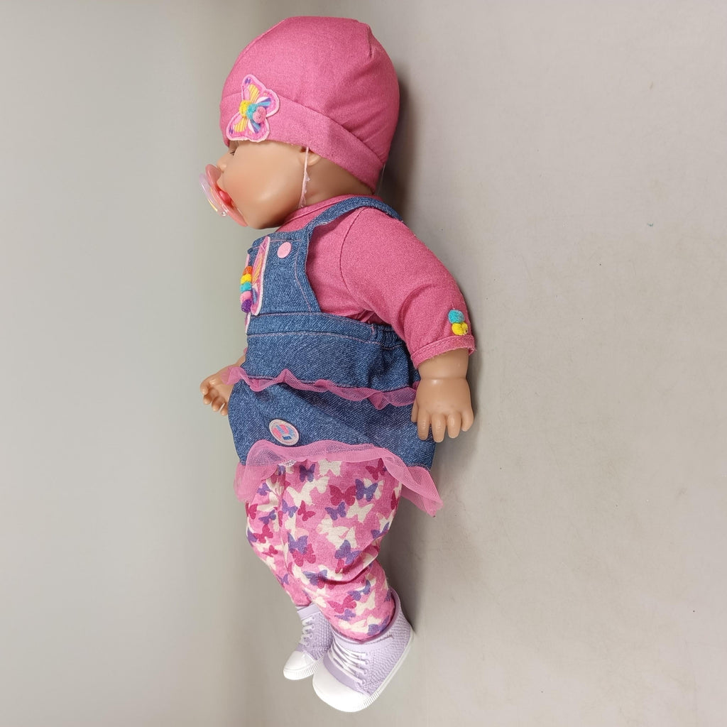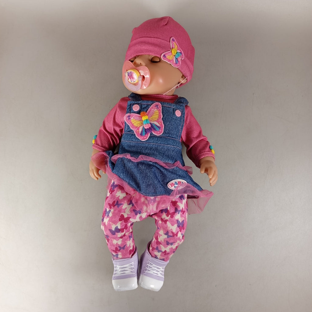 Die BABY born Babypuppe mit Schmetterlings-Outfit und Schnuller ist eine detailreiche Baby-Puppe, die für kreatives und fantasievolles Rollenspiel geeignet ist. Die Puppe trägt ein mehrteiliges Outfit mit Schmetterlingsmotiv, darunter ein pinkes Mützchen, ein langärmeliges Shirt, ein Kleid mit Tüll, gemusterte Hosen, Schuhe und einen Schnuller. Altersempfehlung: 3–5 Jahre. Achtung: Nicht für Kinder unter 3 Jahren geeignet, Erstickungsgefahr.