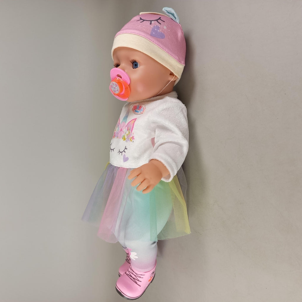 BABY born Baby-Puppe Emma mit Einhorn Outfit – 43 cm bietet vielseitige Spielmöglichkeiten im Bereich Rollenspiel und Alltagssimulation. Die Puppe trägt ein Outfit mit Einhorn-Motiv, bestehend aus einem weißen Langarmshirt, buntem Tüllrock, blauen Leggings, pinkem Hut mit Ohren, pinken Stiefeln sowie einem pinken Schnuller mit Clip. Altersempfehlung: 3–5 Jahre. Achtung: Nicht für Kinder unter 3 Jahren geeignet.
