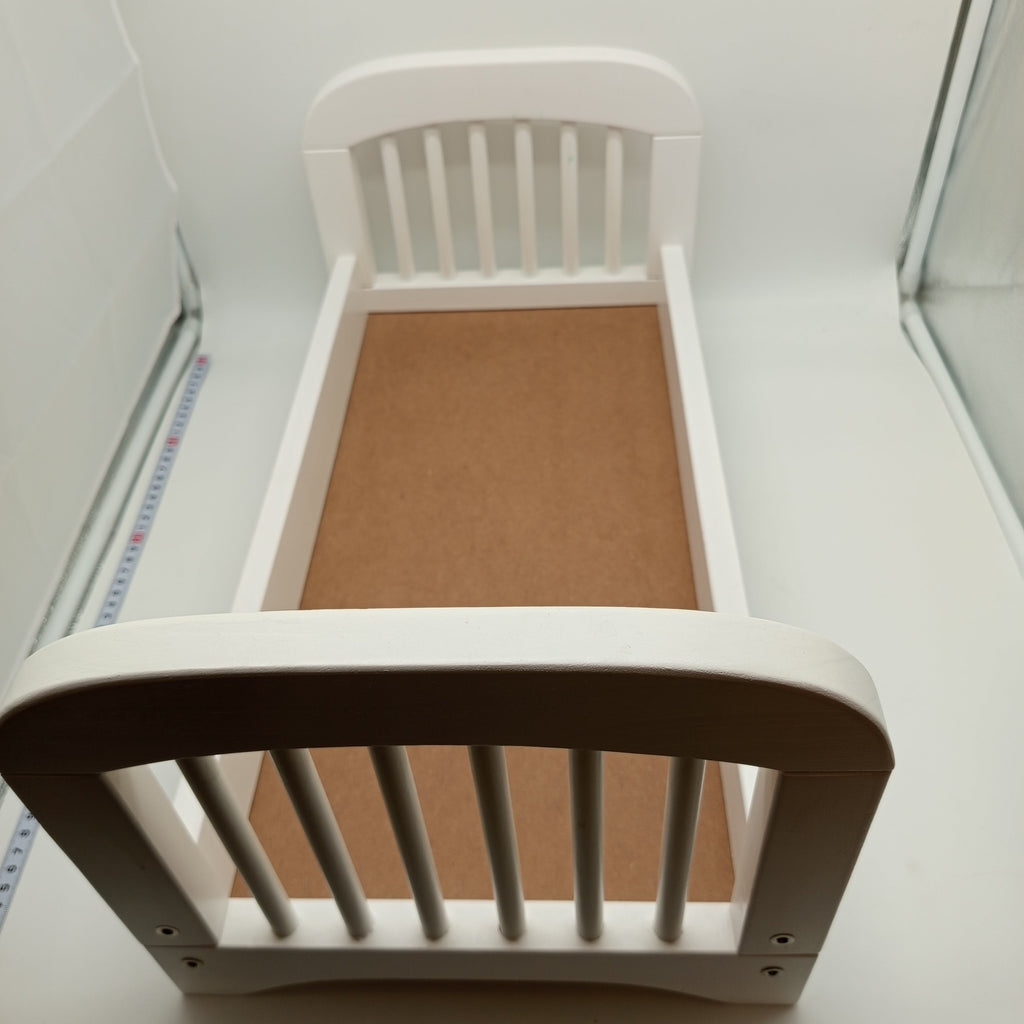 Hol dir das Goki Puppenbett aus Holz und bring Gemütlichkeit ins Kinderzimmer! Das weiße Holzbett mit braunem Bodenbrett überzeugt durch ein schlichtes, zeitloses Design mit Lattenoptik an Kopf- und Fußende. Ideal für Puppen bis ca. 45 cm Größe und perfekt geeignet für Rollenspiele. Das Bett ist vollständig, zeigt nur leichte Gebrauchsspuren und kommt ohne Originalverpackung. Gib diesem liebevoll erhaltenen Spielzeug ein neues Zuhause!