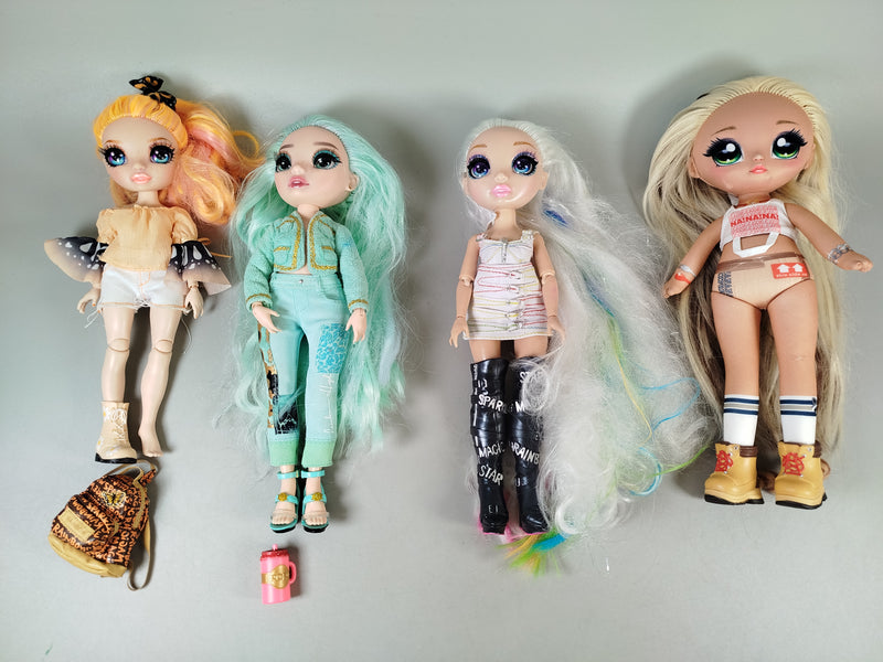 Hol dir das bezaubernde Puppen Spielset und bring Mode und Glamour ins Kinderzimmer! Dieses Set enthält vier Modepuppen in verschiedenen Kleidungsstilen, drei Puppen mit vielen Gelenken von L.O.L. und eine Stoffpuppe von Na Na Na Surprise. Die Puppen sind ca. 30 cm groß, zeigen Gebrauchsspuren an Kleidung und Haar und da das Set frei zusammengestellt ist, können Einzelteile vom Originalset abweichen oder fehlen. Dieses Modepuppenset ist perfekt, um die eigene Puppensammlung zu erweitern und Styles an neuen Charakteren auszuprobieren. Gib diesem Spielzeug ein neues Zuhause und unterstütze die Wiederverwendung von Spielzeug. Hinweis: Ein Schuh der linken Modepuppe fehlt. Achtung: Aufgrund von Kleinteilen nicht für Kinder unter 3 Jahren geeignet.