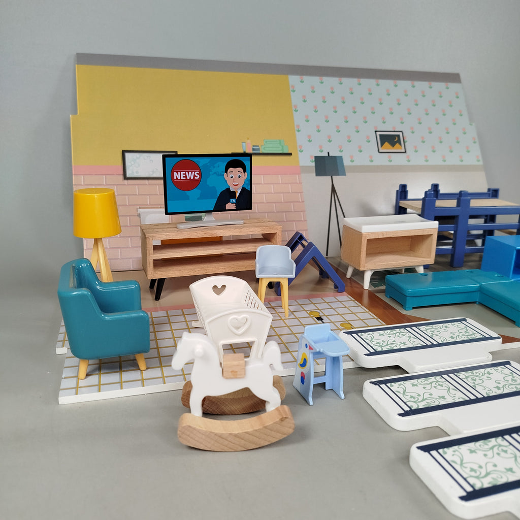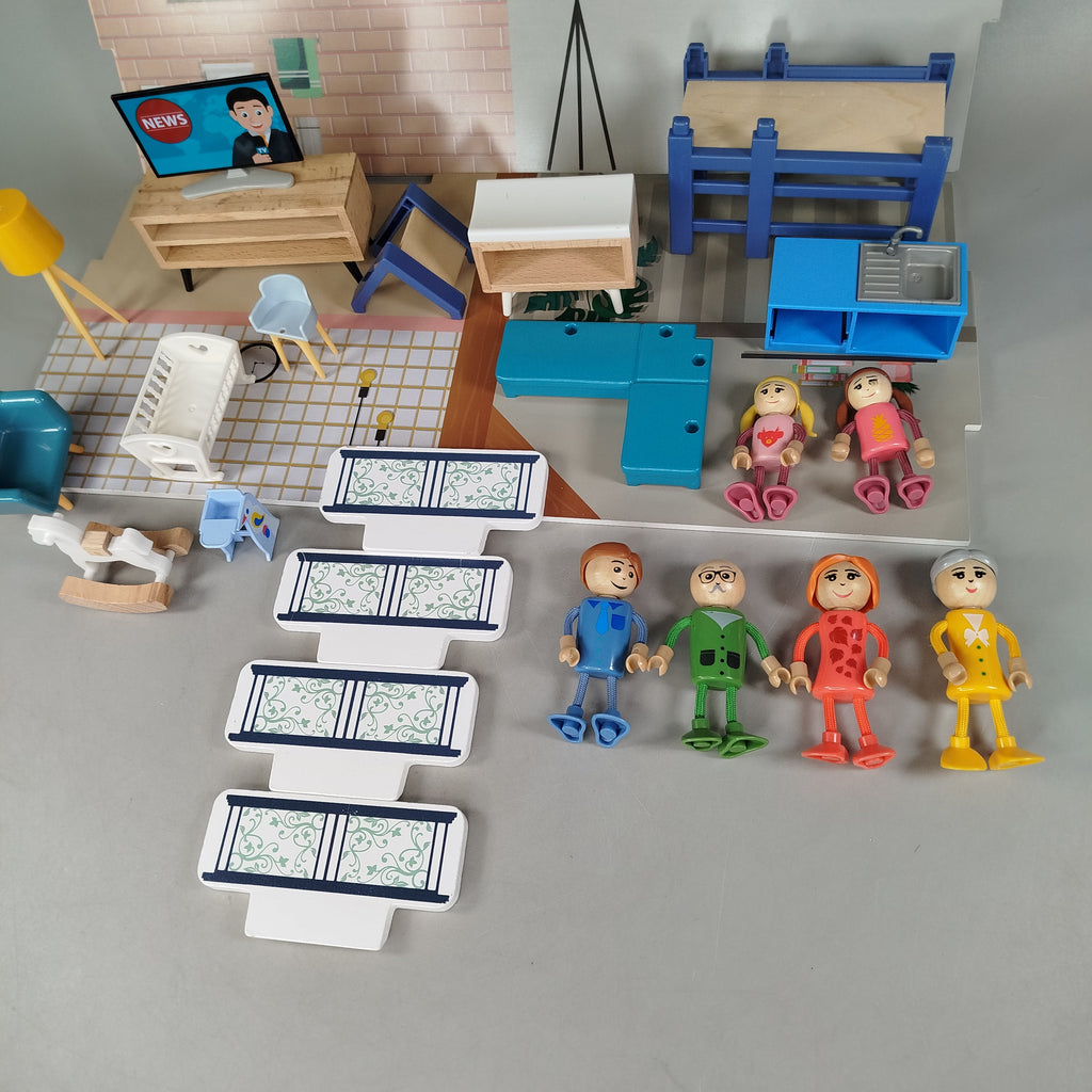 Hol dir das charmante Holz Puppenhaus mit zwei Etagen und aufklappbarer Front! Mit 6 Figuren und 26 Möbelstücken wie Etagenbett, Sofa, Küche und Bad bietet es viele Spielmöglichkeiten für kreatives Rollenspiel. Das Puppenhaus zeigt leichte Gebrauchsspuren, ist aber stabil und spielbereit. Vollständigkeit konnte nicht überprüft werden. Verpackung und Anleitung fehlen. Hinweis: Nicht für Kinder unter 3 Jahren geeignet, da kleine Teile verschluckt werden können.