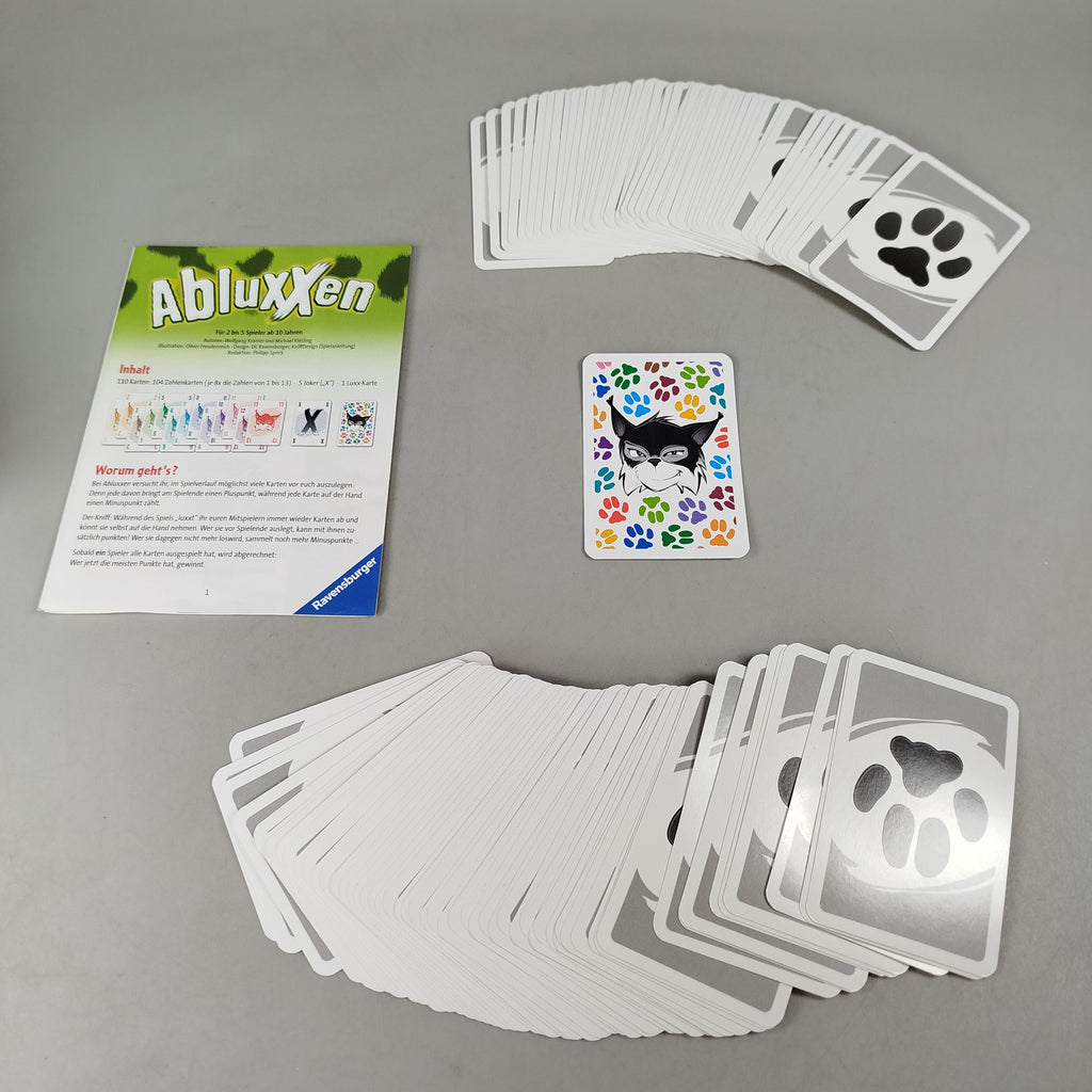Hol dir das Kartenspiel Abluxxen von Ravensburger und stürz dich in ein taktisches Kartenklau-Abenteuer für 2 bis 5 Spieler ab 10 Jahren. Gespielt wird mit Zahlen- und Sonderkarten rund um cleveres Nehmen und Abwehren, begleitet von einer deutschen Spielanleitung. Gib diesem Spiel ein neues Zuhause und verlängere seinen Spielspaß. Sicherheitshinweis gemäß GPSR: Enthält Kleinteile, nicht geeignet für Kinder unter 3 Jahren. Erstickungsgefahr!