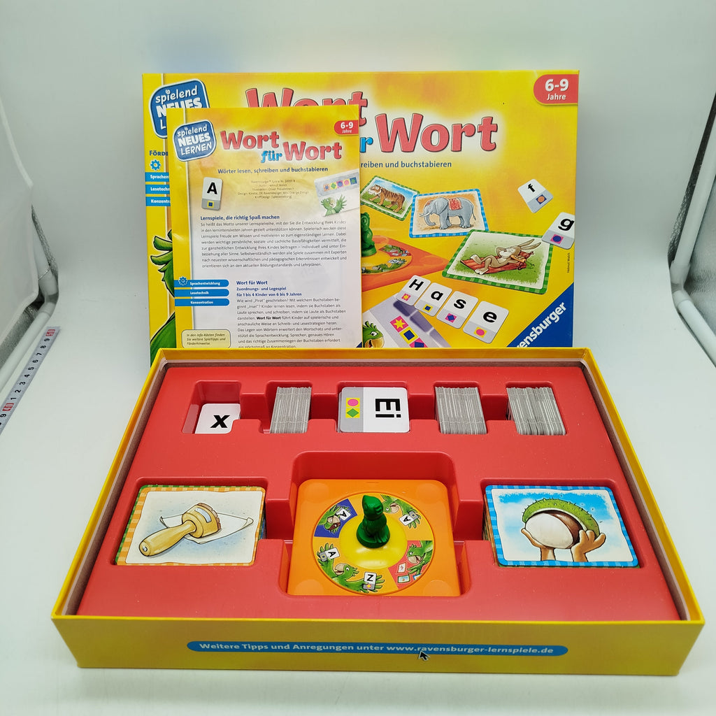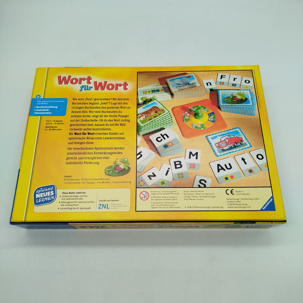 Hol dir das Lernspiel Wort für Wort von Ravensburger und entdecke spielerisch die Welt der Wörter. Das Gesellschaftsspiel richtet sich an Kinder von 6–9 Jahren und fördert Lesen, Schreiben und Buchstabieren mit Bildkarten, Buchstabenmaterial und einem Drehelement. Geeignet für 2–4 Spieler und ideal für gemeinsames Lernen zu Hause. Gib diesem Spielzeug ein neues Zuhause und schenke ihm eine zweite Runde voller Lernspaß. Hinweis gemäß GPSR: Enthält Kleinteile, nicht geeignet für Kinder unter 3 Jahren. Erstickungsgefahr!