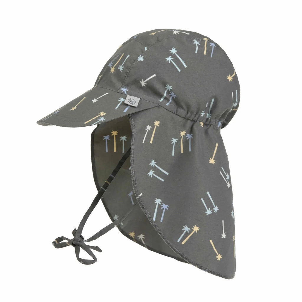 Der olivgrüne Sonnenhut mit extra langem Nackenschutz und UV-Schutz 80 schützt den Kopf, Nacken und die Augen von Babys und Kleinkindern. Das niedliche Palmen Design und das schnelltrocknende Obermaterial sorgen für unbeschwerte Sommertage.