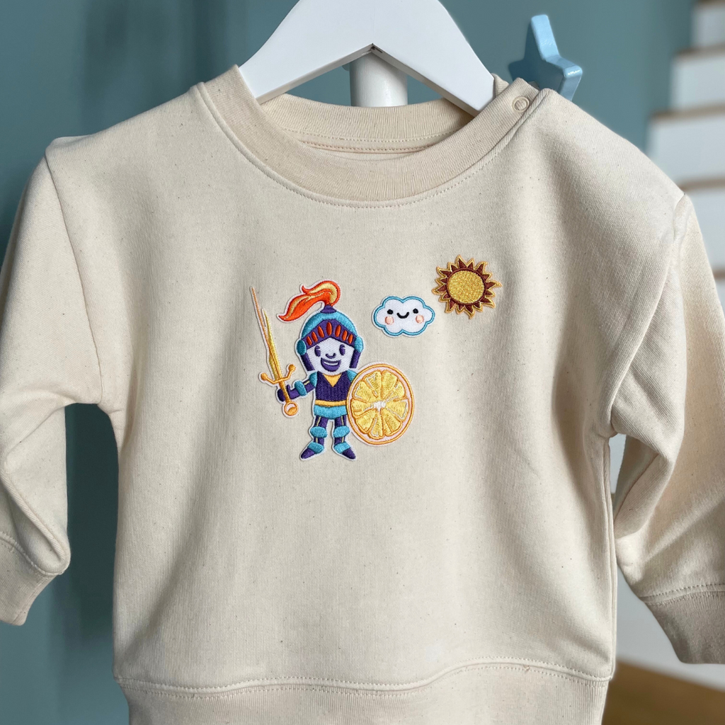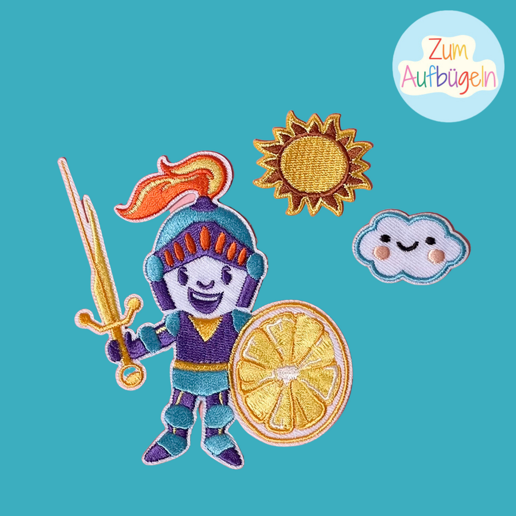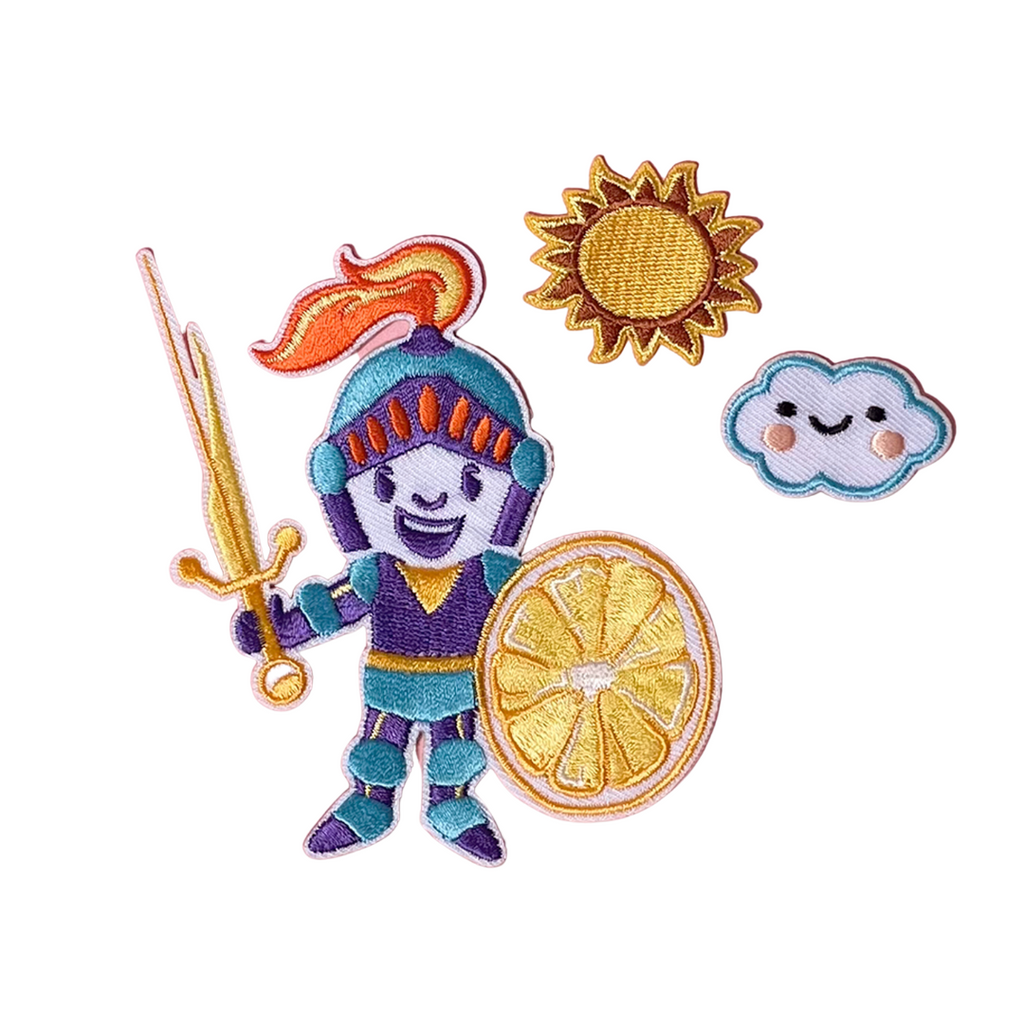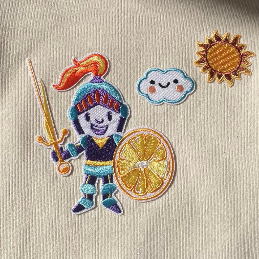 Der Ritter vom Obst auf unseren Patches ist kein Unbekannter. Er ist bereits aus unserer beliebten T-Shirt- und Sweater-Kollektion bekannt. Er ist mutig, tapfer und immer bereit für ein neues Abenteuer. Zusammen mit der strahlenden Sonne und der lieben Wolke wird er jedes Kleidungsstück zum Blickfang machen.