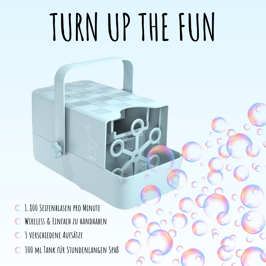 Bringen Sie Farbe und Freude in jede Feier mit der LALARMA Seifenblasenmaschine. Diese innovative, schnurlose Maschine erzeugt bis zu 1.800 Seifenblasen pro Minute, schneller und unterhaltsamer als jeder andere Partygast. Perfekt für Geburtstagsfeiern, Hochzeiten oder einfach nur zum Spaß im Garten!