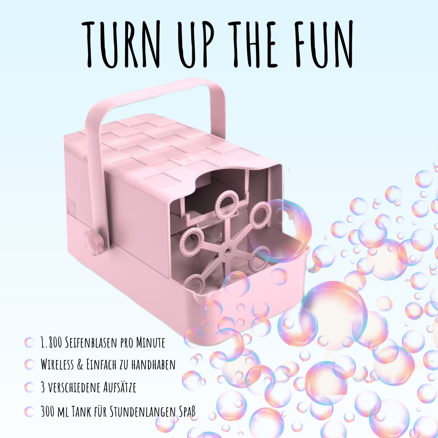 - Hochleistungsblasenproduktion: Mit einer beeindruckenden Geschwindigkeit von 1.800 Seifenblasen pro Minute übertrifft sie jeden anderen Partygast.