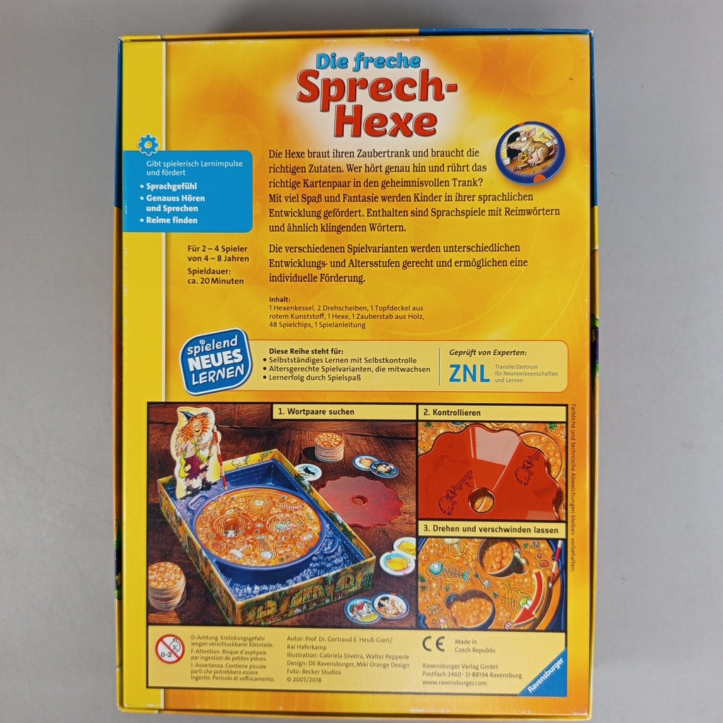 Hol dir das Ravensburger Lernspiel 'Die freche Sprech-Hexe' aus der Reihe spielend NEUES LERNEN und entdecke spielerisch die Welt der Sprache. Ideal für 2–4 Spieler ab 4 Jahren, Spieldauer ca. 20 Minuten. Enthält eine Hexenfigur, drehbare Scheiben, Zauberstab, Hexenkessel, Spielplättchen und Anleitung. Das Spiel befindet sich in gutem gebrauchten Zustand mit leichten Gebrauchsspuren. Verpackung vorhanden, Vollständigkeit konnte nicht überprüft werden. Gib diesem schönen Lernspiel ein neues Zuhause und fördere spielerisch Sprachgefühl und Konzentration!