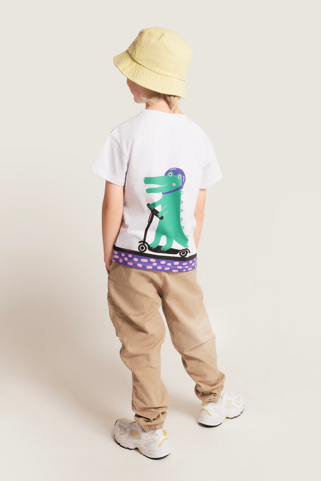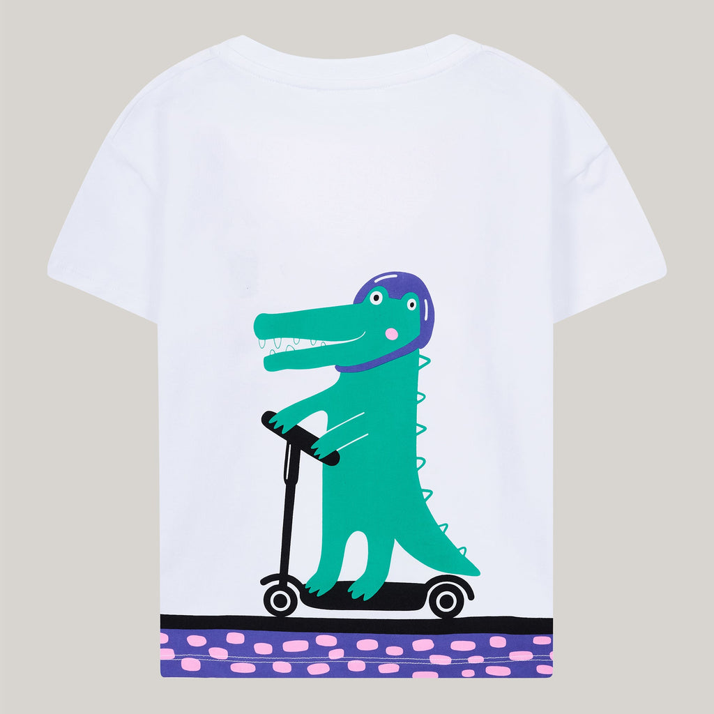 Dieses weiße Shirt bringt Schwung in den Alltag! Auf der Rückseite zeigt ein knalliger Popart-Print das freche Krokodil auf dem Scooter, vorne gibt’s einen kleinen, feinen Print auf der Brust – für Style, der von vorne bis hinten überzeugt.