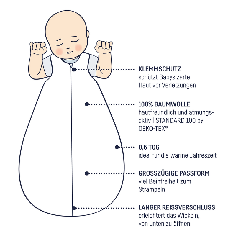 - Babyschlafsack (2,5 TOG) geeignet für das gesamte Jahr, mit einem verdeckten mittigen Reißverschluss für ein müheloses An- und Ausziehen.