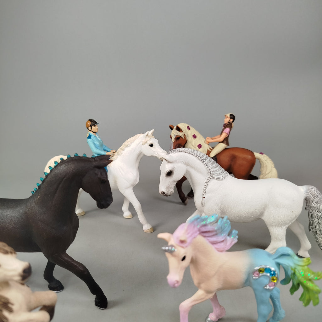 Hol dir das detailreiche Schleich Figuren-Set mit 6 Pferden und 2 Reitern und bring Leben in dein Spielregal! Die realistisch gestalteten Tiere und Figuren eignen sich ideal für fantasievolle Reiterhof-Abenteuer. Das Set enthält insgesamt acht Figuren, darunter verschiedene Pferderassen und Reiter in passender Ausrüstung. Die Figuren bestehen aus robustem Kunststoff und sind etwa 7–12 cm groß. Die Verpackung fehlt, aber die Figuren sind in einem sehr guten gebrauchten Zustand. Gib diesen beliebten Schleich-Figuren ein neues Zuhause und fördere spielerisch Kreativität und Fantasie. Hinweis: Enthält Kleinteile, nicht geeignet für Kinder unter 3 Jahren.
