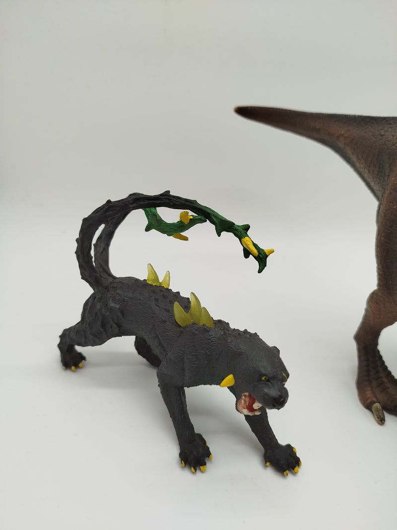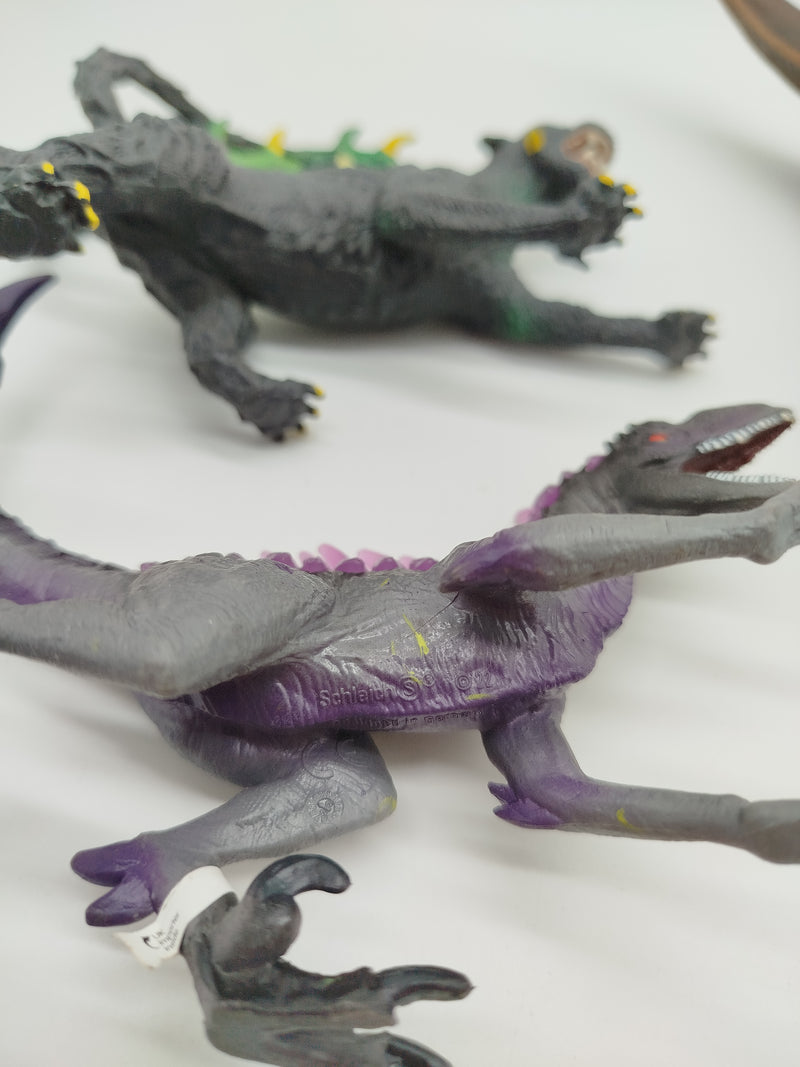 Dieses Schleich Set enthält zwei Fabelwesen und einen Dinosaurier. Im Detail handelt es sich um eine schwarze Panther-ähnliche Kreatur mit gelben Krallen und durchsichtigen Stacheln, einen realistischen Tyrannosaurus Rex und einen grauen Dinosaurier mit violetten Stacheln. Alle Figuren zeigen typische Gebrauchsspuren. Gib diesem Spielzeug ein neues Zuhause und unterstütze die Wiederverwendung von Spielzeug. Hinweis: Nicht für Kinder unter 3 Jahren geeignet, da Kleinteile verschluckt werden können.