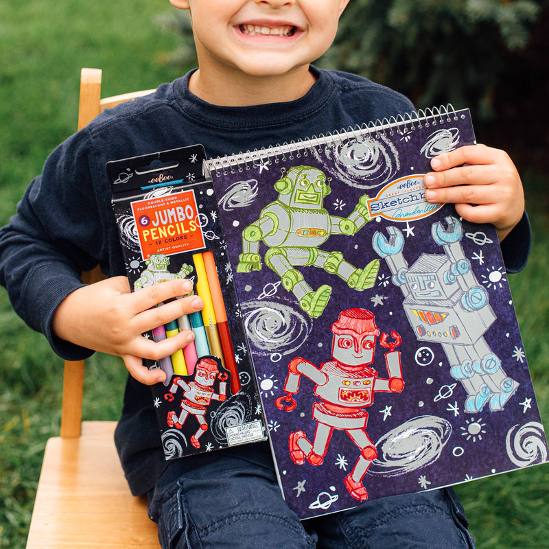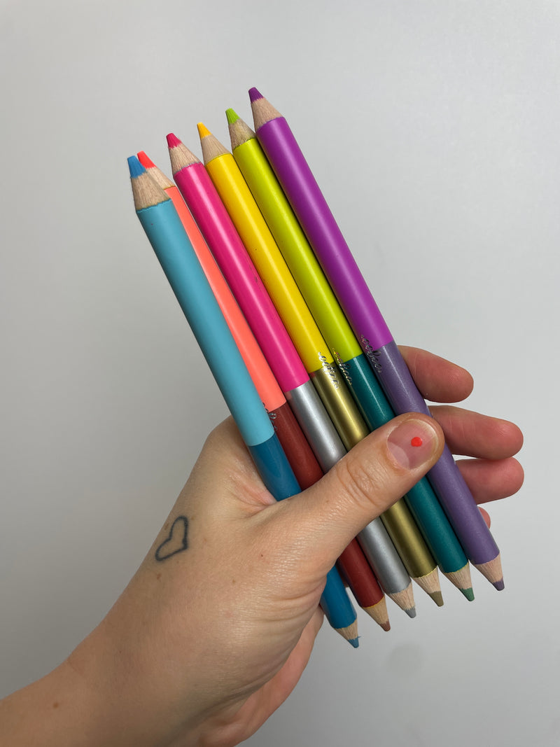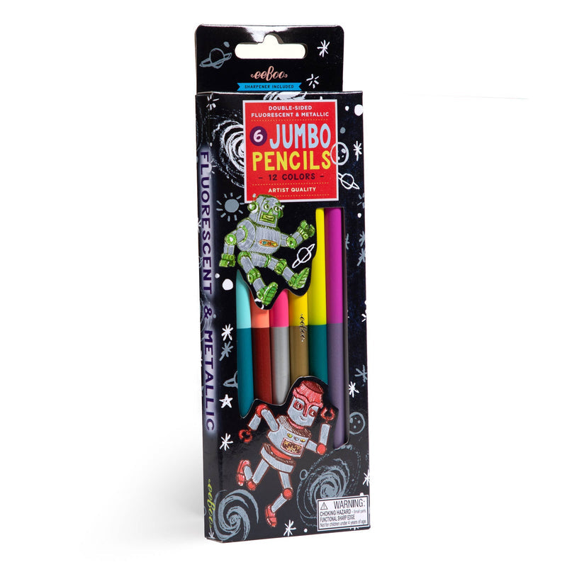 Sechs große, leicht zu handhabende, doppelseitige Jumbo-Bleistifte, insgesamt 12 Farben, um Ihren Kunstwerken alle Arten von Farbe zu verleihen! Für leuchtende oder metallische Farben drehen Sie die Stifte einfach um.