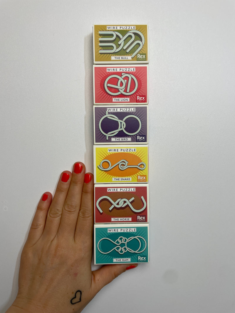 Verschiedene Geschicklichkeitsspiele aus Metall, bei denen mehrere geformte Metallteile miteinander verbunden und wieder getrennt werden müssen. Eine unterhaltsame Möglichkeit, das Gehirn zu stimulieren und herauszufordern.