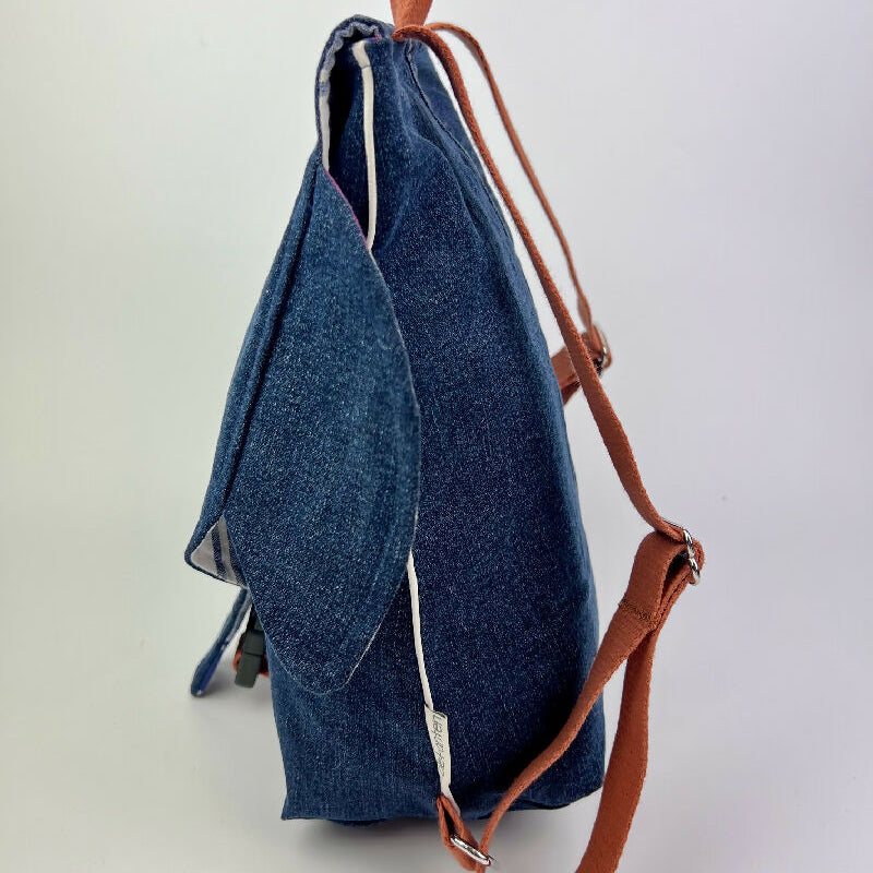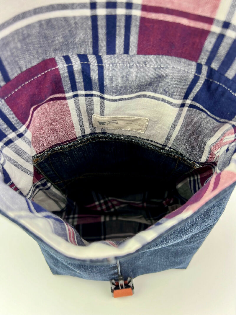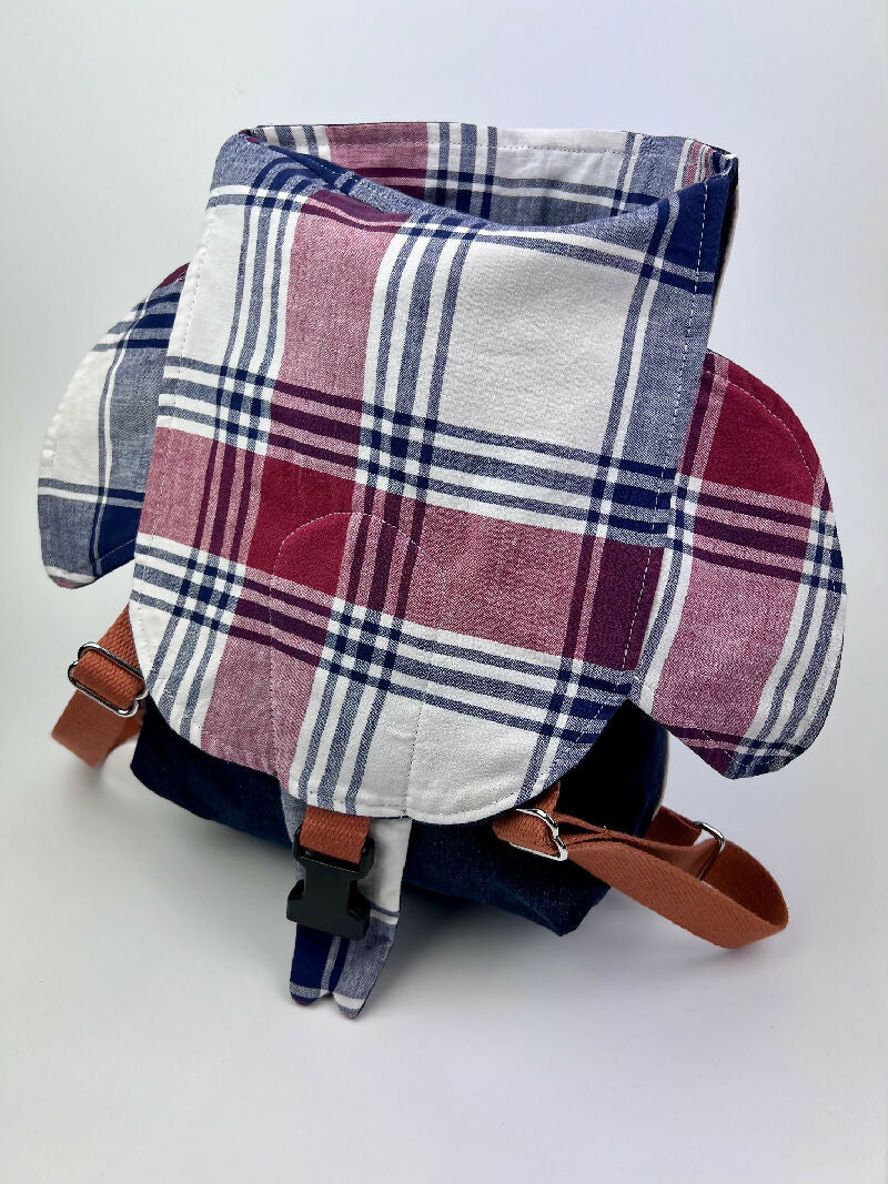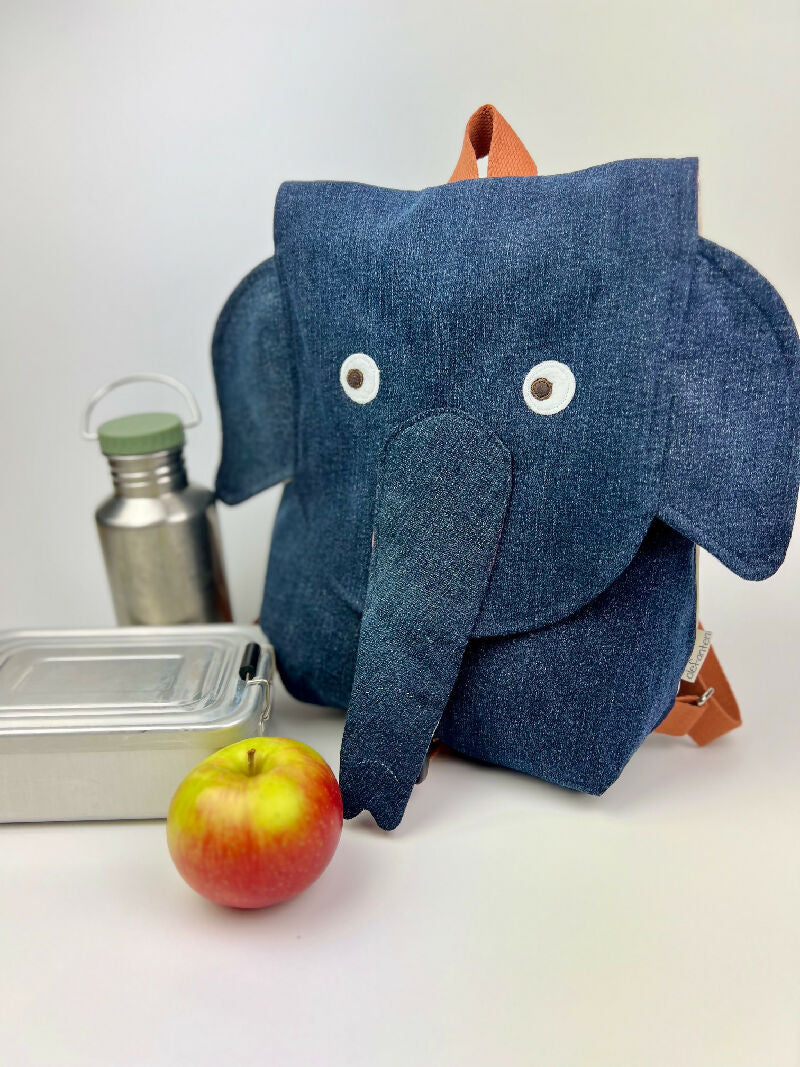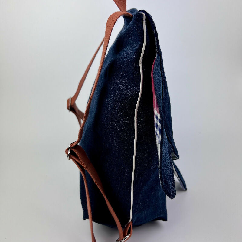 Kinderrucksack aus einer dunkelblauen Jeans mit Innentasche und verstellbaren Gurten und einem karierten Futter in Dunkelrot-Weiß-Blau. An den Seiten wurde ein Reflex-Paspelband zur besseren Sichtbarkeit im Dunkeln eingearbeitet. Der Rucksack wird mit einer Steckschnalle verschlossen, die sich sehr einfach von Kinderhänden öffnen und schließen lässt. Olefanten Rucksäcke sind schön handlich und eignen sich perfekt für die Kita oder den Kindergarten.