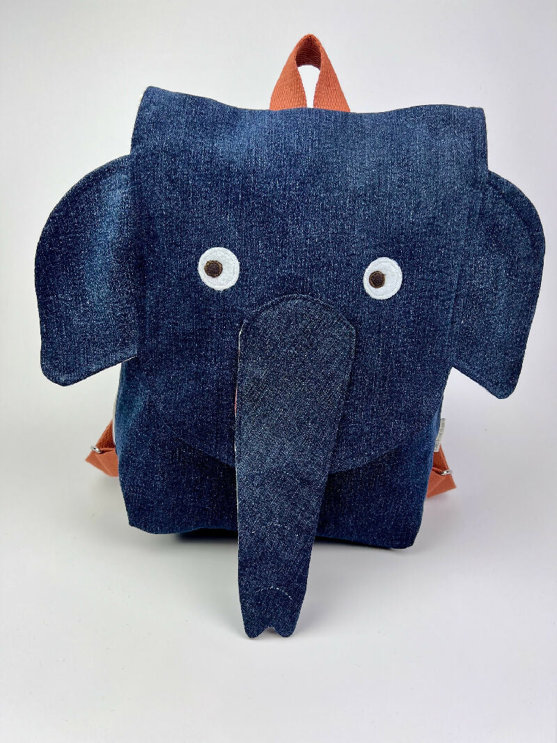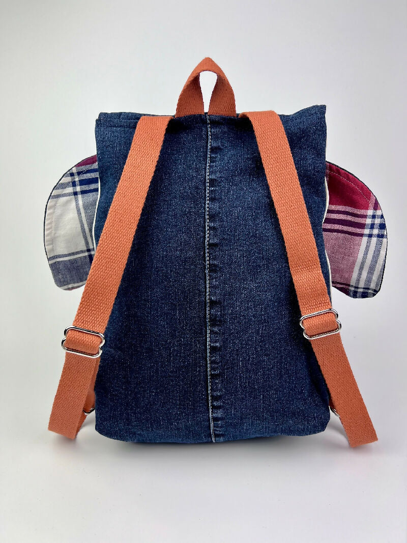 Für die Aufhänger und Tragegurte wurden Baumwollband und Metallringe/-schnallen verarbeitet. Eine Steckschnalle aus recyceltem Kunststoff verschließt den Rucksack. Die Augen bestehen aus Filz und die Rucksackklappe wurde mit einer Bügeleinlage aus Baumwolle verstärkt.