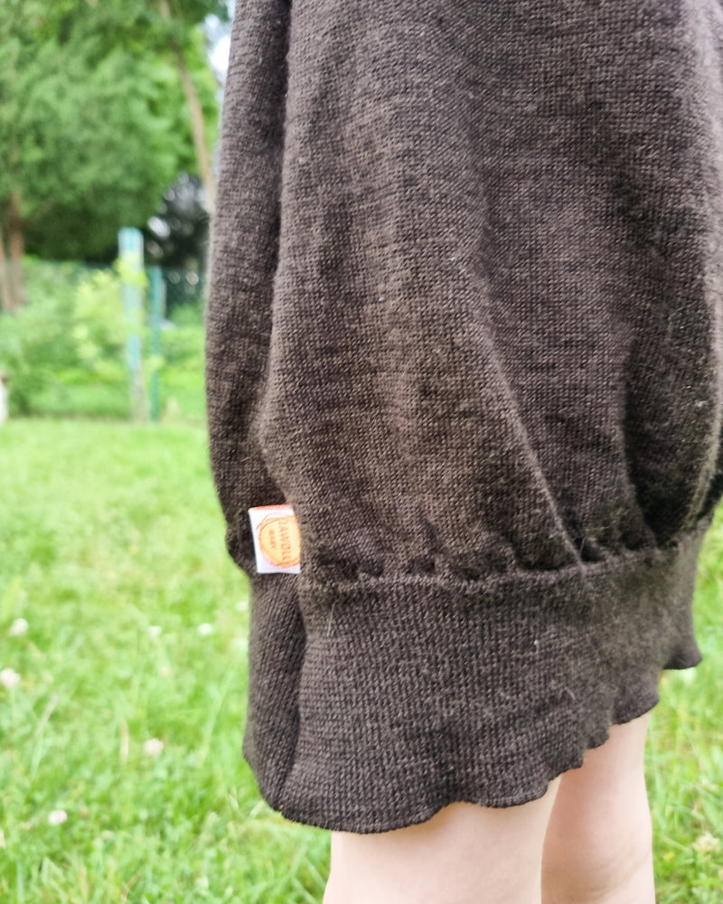 Dieses Unisex-Kleid war mal ein beschädigter Wollpullover. Durch Upcycling rettet Jawoll Baby das wertvolle Material Wolle. Das Wollmaterial (100% Wolle) ist dabei wunderbar leicht und auch für wärmere Temperaturen geeignet.