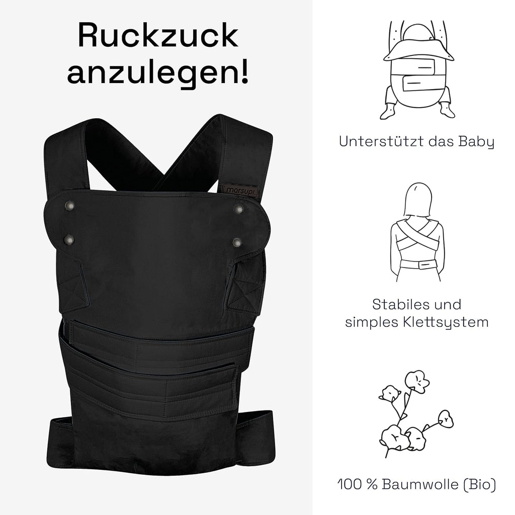 Einfaches Anlegen: Die marsupi Classic Babytrage verfügt über ein einfaches und stabiles Klett-Verschlusssystem, das ein einfaches An- und Ablegen ohne Knoten oder Schnallen ermöglicht, perfekt für Traganfänger