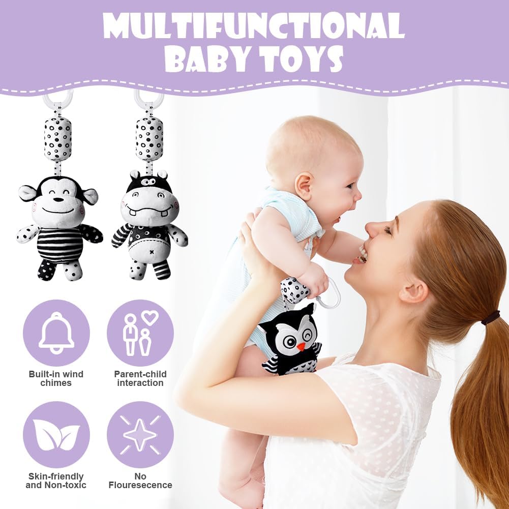 ♫ 【Schwarz-weißes Entwicklungsspielzeug】 Visuelle und akustische Reisespielzeuge sind Spielzeuge, die für Neugeborene geeignet sind, während schwarz-weiße Kinderwagenspielzeuge eine der effektivsten Möglichkeiten sind, die Sehkraft von Neugeborenen zu stimulieren. Verschiedene Tiermuster entwickeln und stimulieren die Sehfähigkeit des Babys.