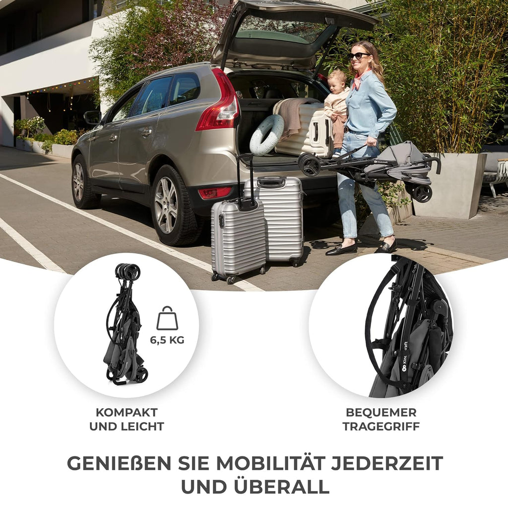 Das ausklappbare Verdeck schützt das Kind bei Spaziergängen vor Wind und Nieselregen und spendet Schatten. In dem Verdeck gibt es ein Fenster für den Blickkontakt der Eltern mit dem Kind. Der Kinderwagen hat einen bequemen Tragegriff.