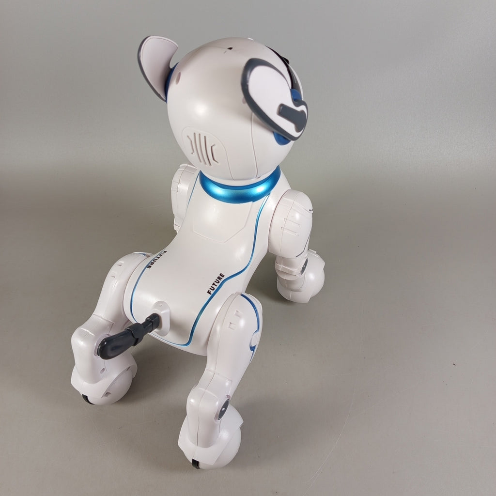 Hol dir den interaktiven Roboterhund und bring Technikspaß ins Kinderzimmer! Dieser futuristisch gestaltete Hund in Weiß mit blauen und schwarzen Akzenten kann tanzen, Geräusche imitieren und per Fernbedienung gesteuert werden. Das Spielzeug zeigt leichte Gebrauchsspuren, die Ladeleitung fehlt und die OVP ist nicht vorhanden. Der Hund und die Fernbedienung sind jedoch funktional. Geeignet für Kinder ab 6 Jahren. Gib diesem coolen Robohund ein neues Zuhause und entdecke spielerische Technik neu!