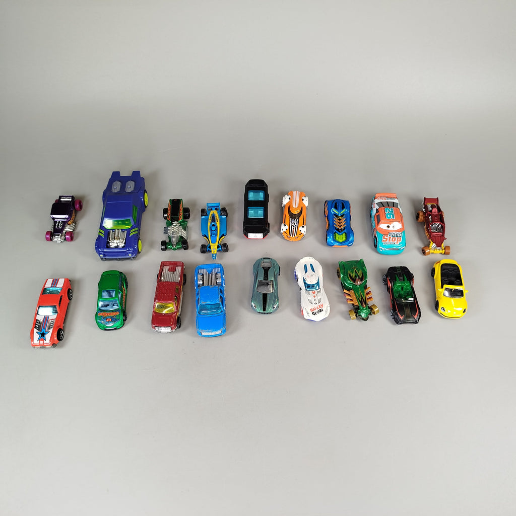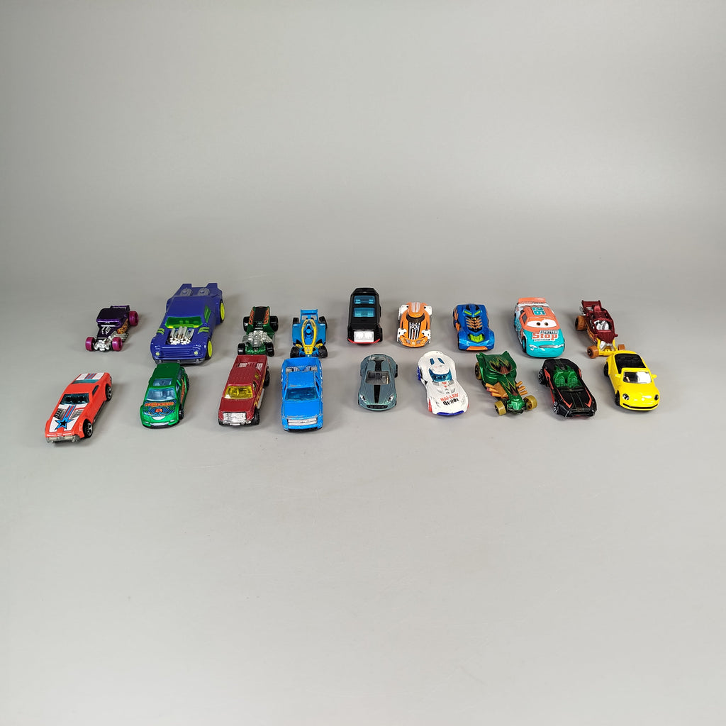 Hol dir das aufregende Hot Wheels Autoset für endlose Rennen und Abenteuer! Diese Sammlung umfasst 18 verschiedene Modelle, darunter klassische Muscle Cars, Sportwagen und fantasievoll gestaltete Fahrzeuge wie der Harley Quinn-Themenwagen und ein Auto aus Disneys *Cars*-Franchise. Die Autos sind in einer Vielzahl von Farben wie Rot, Grün, Blau, und mehr gestaltet und verfügen über coole Details wie Spoiler und Rennstreifen. Gib diesen gebrauchten Autos ein neues Zuhause und bereite deinen kleinen Rennfahrern Freude! Hinweis: geeignet für Kinder ab 3 Jahren. Zustand der Autos: gut, mit sichtbaren Gebrauchsspuren wie Kratzern und Lackabnutzungen.