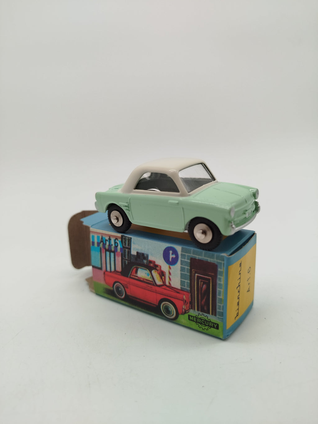 Hol dir das detailreiche Mercury Modellauto Bianchina Art. 6 und entdecke italienisches Vintage-Design im Miniformat. Das mintgrün-beige Fahrzeug besteht aus Metallguss und kommt in seiner originalen, farbenfroh gestalteten Box. Perfekt für Sammler von historischen Die-Cast-Modellen. Das Spielzeug befindet sich in neuem Zustand mit OVP und ist vollständig.