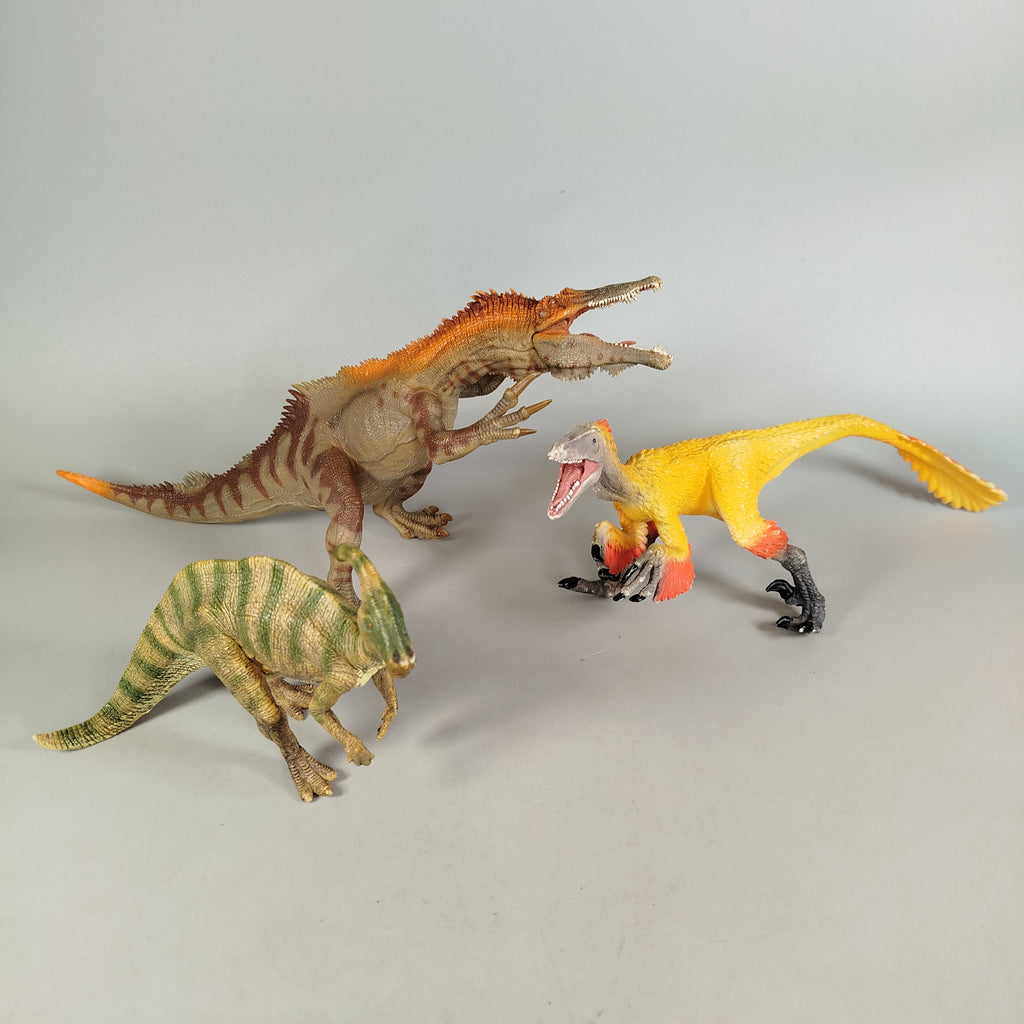 Hol dir das Schleich Dinosaurier Set mit Spinosaurus, Velociraptor und Parasaurolophus. Die realistisch gestalteten Figuren fördern kreatives Spielen und sind ideal für kleine Dino-Fans. Die Figuren sind gebraucht, zeigen nur geringe Gebrauchsspuren und kommen ohne Originalverpackung. Gib diesen tollen Sammlerfiguren ein neues Zuhause!
