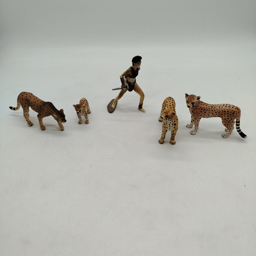 Hol dir das Figuren-Set mit einem Krieger und vier Geparden in verschiedenen Posen. Die robusten Kunststofffiguren bieten spannende Abenteuerwelten für fantasievolles Spielen. Verpackung fehlt, Figuren in sehr gutem gebrauchten Zustand. Gib diesen Tierfiguren ein zweites Zuhause und fördere kreatives Rollenspiel.