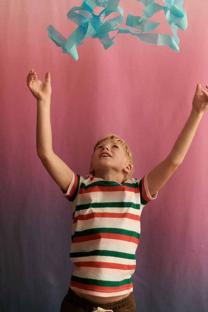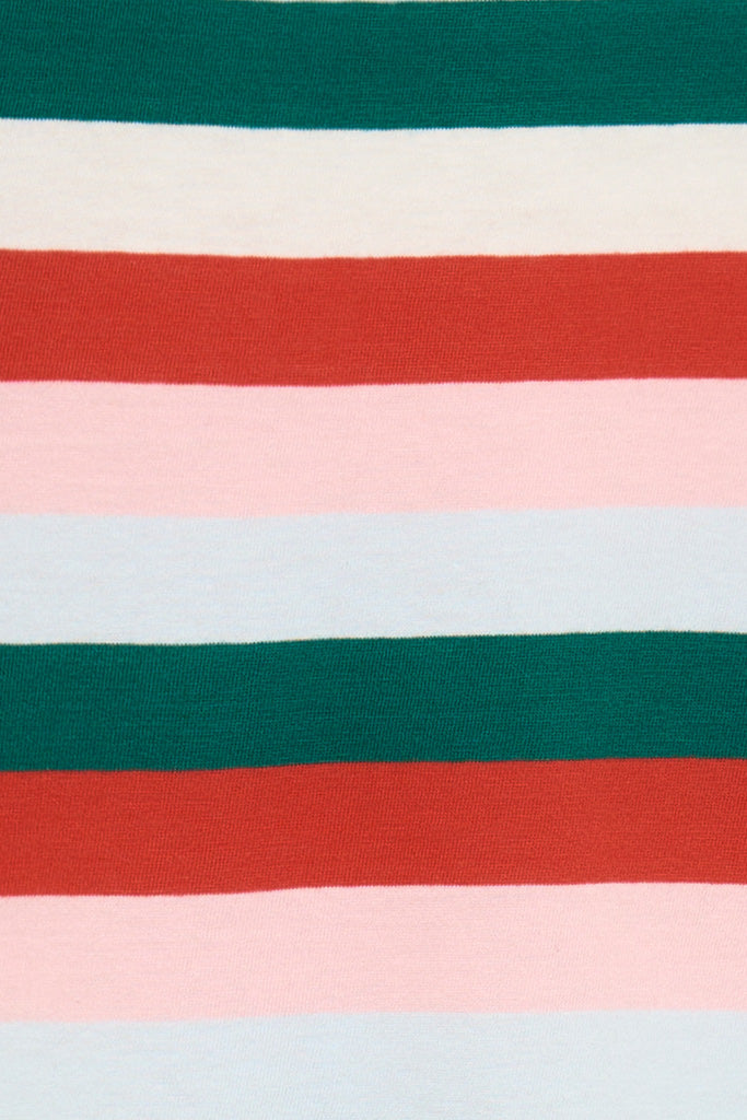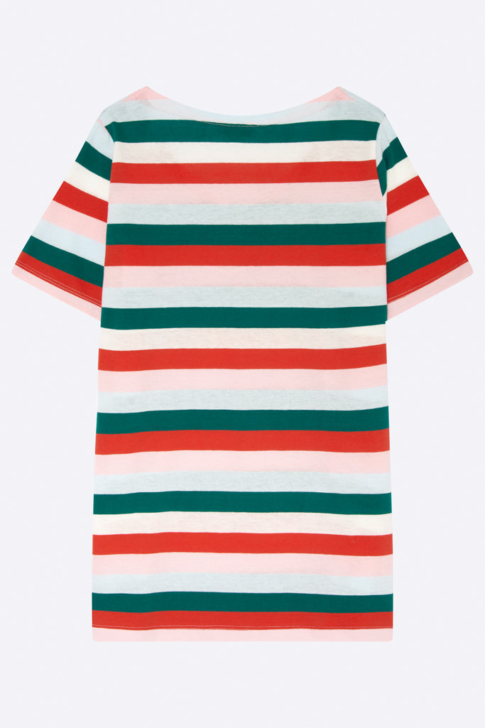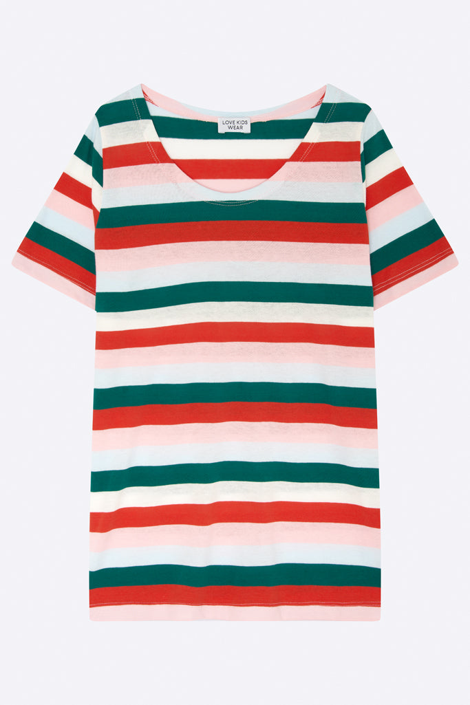 Das Balthasar T-shirt ist ein gerade geschnittenes T-shirt aus Bio Baumwoll-Jersey in rosa, rot, dunkelgrün / hellblau gestreift.