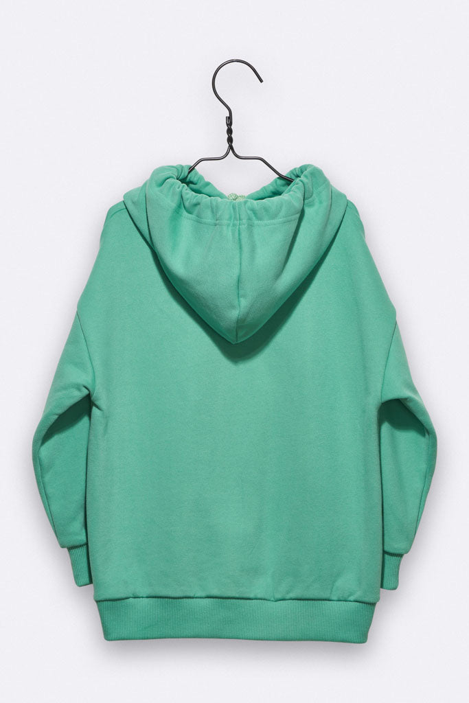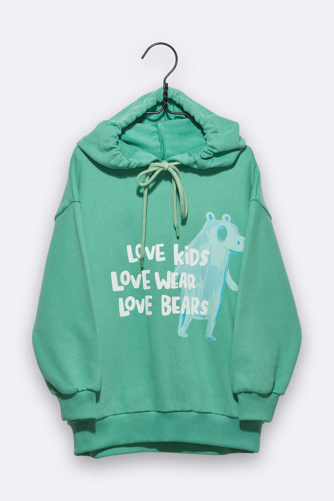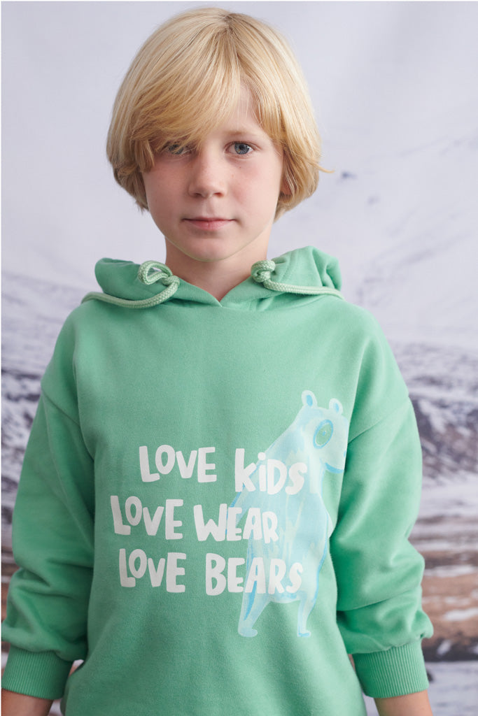 Der Lenzi Hoody ist ein oversized Kapuzenpulli aus mattgrünem Sweat Bio Baumwolljersey. Auf der Brust hat er den LOVE KIDS, LOVE WEAR, LOVE BEAR Print.