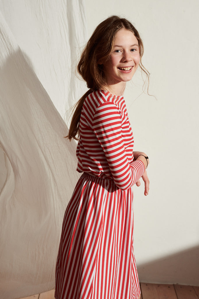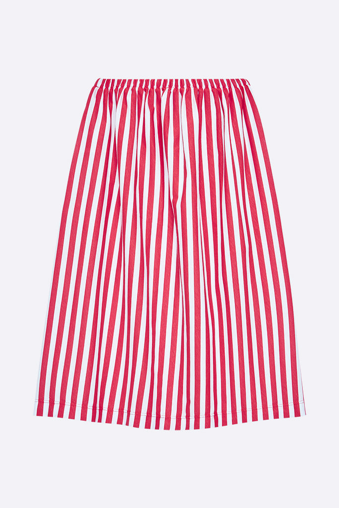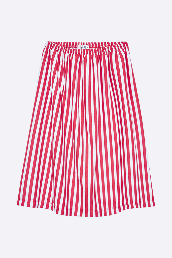Der Linda Rock in hellblau / rot gestreift ist aus 100% Bio Baumwolle gefertigt. Er hat einen A-Linienförmigen Schnitt und eine Midi Länge.