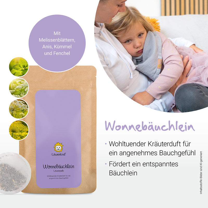 Die Löwenkind Wonnebäuchlein 10er-Packung ist die sanfte Kräuterlösung für Babys und Kleinkinder mit einem empfindlichen Bauch. Jedes Pad enthält eine bewährte Mischung aus Melissenblättern, Anis, Kümmel und Fenchel – diese Kräuter werden zur Unterstützung der Verdauung und zur Beruhigung bei Bauchunruhe eingesetzt.