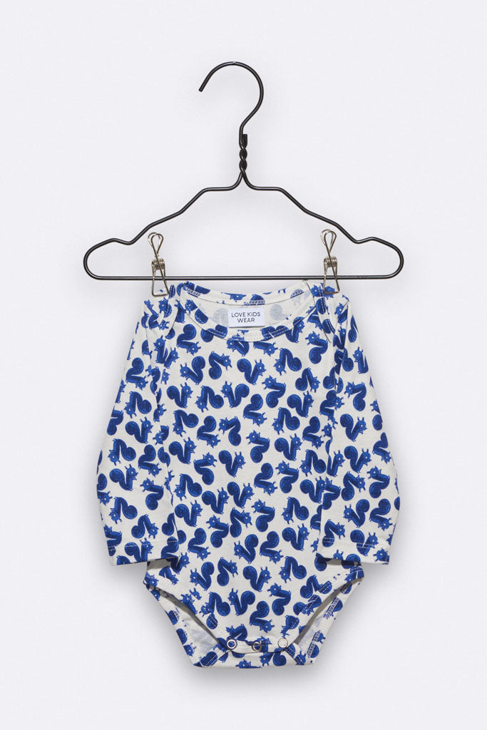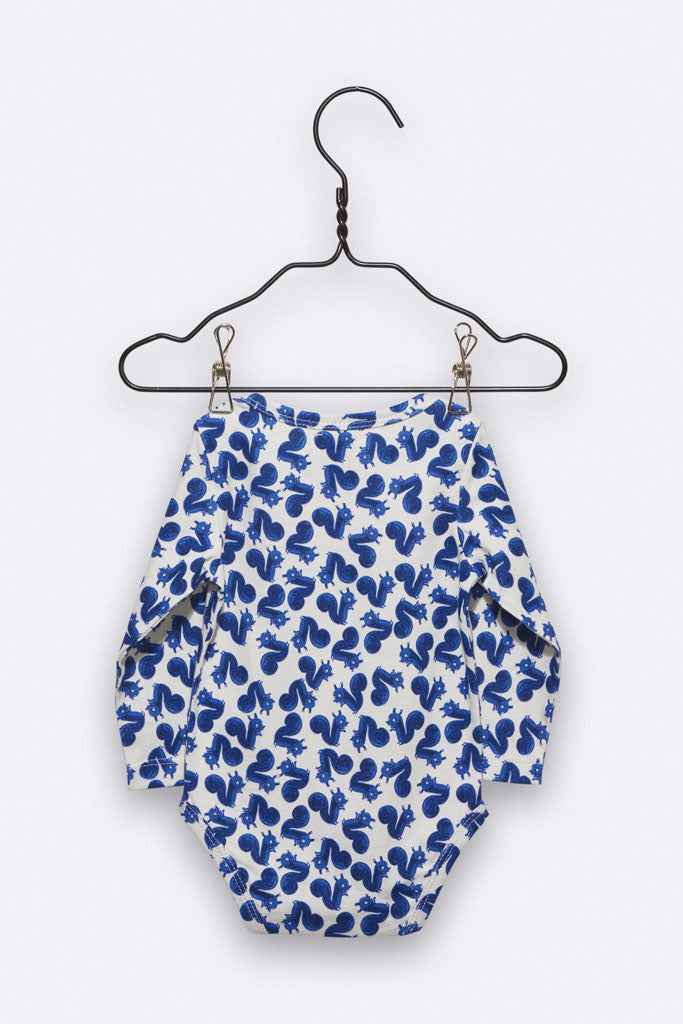 Der Luke Body ist ein klassischer Body aus Bio-Baumwoll Jersey mit dem Eichhörnchen Print in lila und blau.