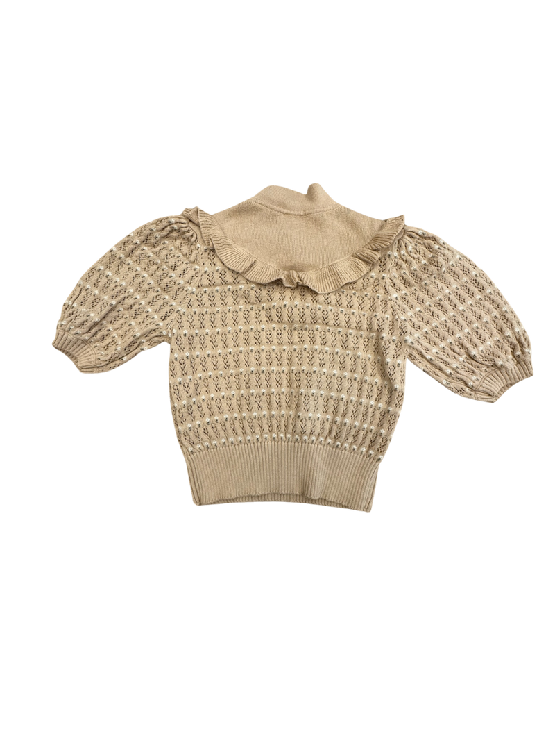 Ein eleganter Beigemelan Pullover mit raffiniertem Muster und voluminosen Puffärmeln. Das Modell wirkt durch seine Textur warm und stilvoll, ideal für die kühlere Jahreszeit. Die Rüschendetails am Kragen setzen einen femininen Akzent, während die flexible Passform Tragekomfort bietet.