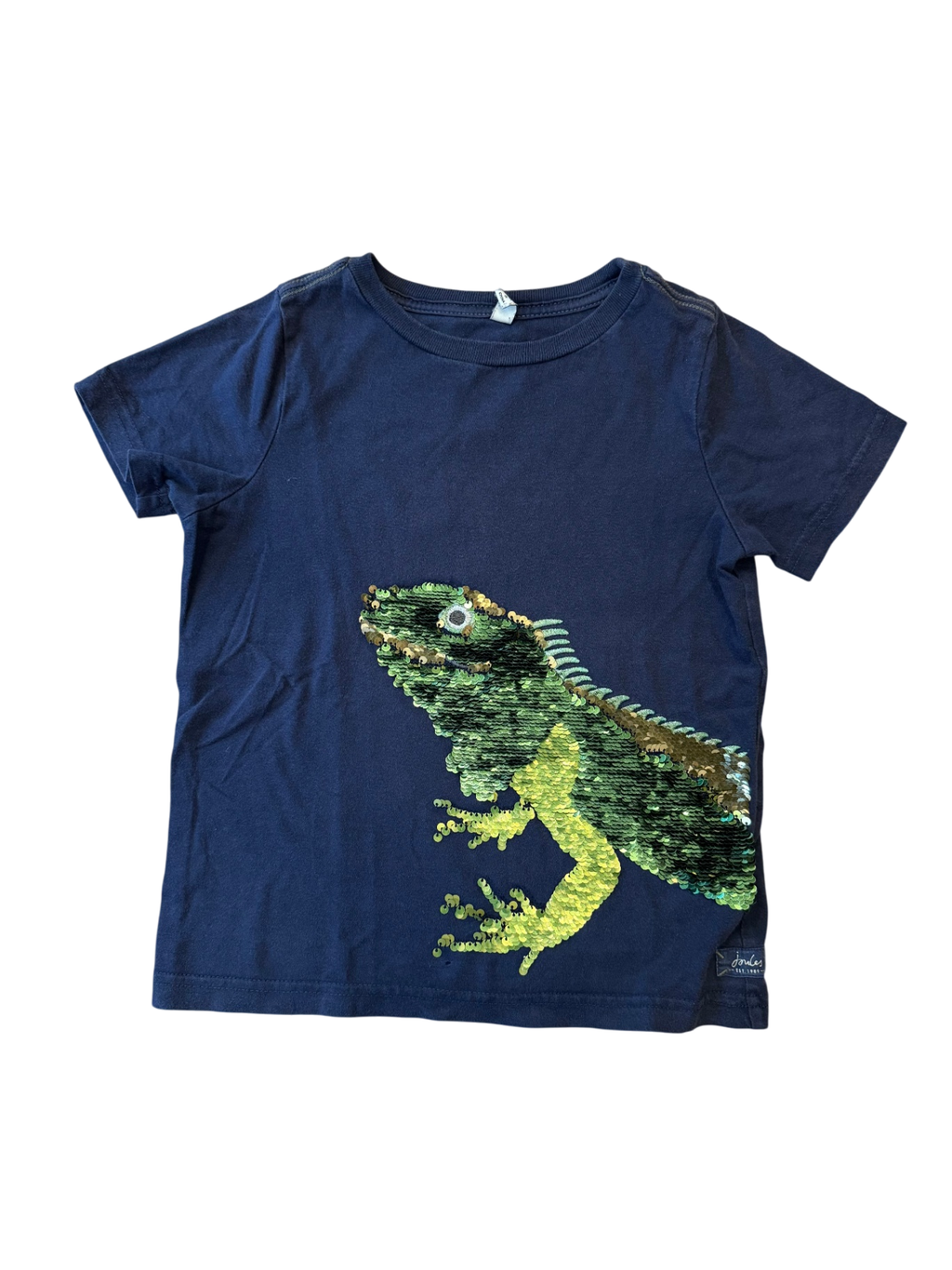 Dieses hochwertige Secondhand Kinder-T-Shirt von Joules ist perfekt für urban-lässige Kids. Das dunkelblaue Design mit einem coolen, glitzernden Dinosaurier-Motiv macht es zu einem echten Blickfang. Komfort trifft auf Style – ideal für deine abenteuerlichen Tage.