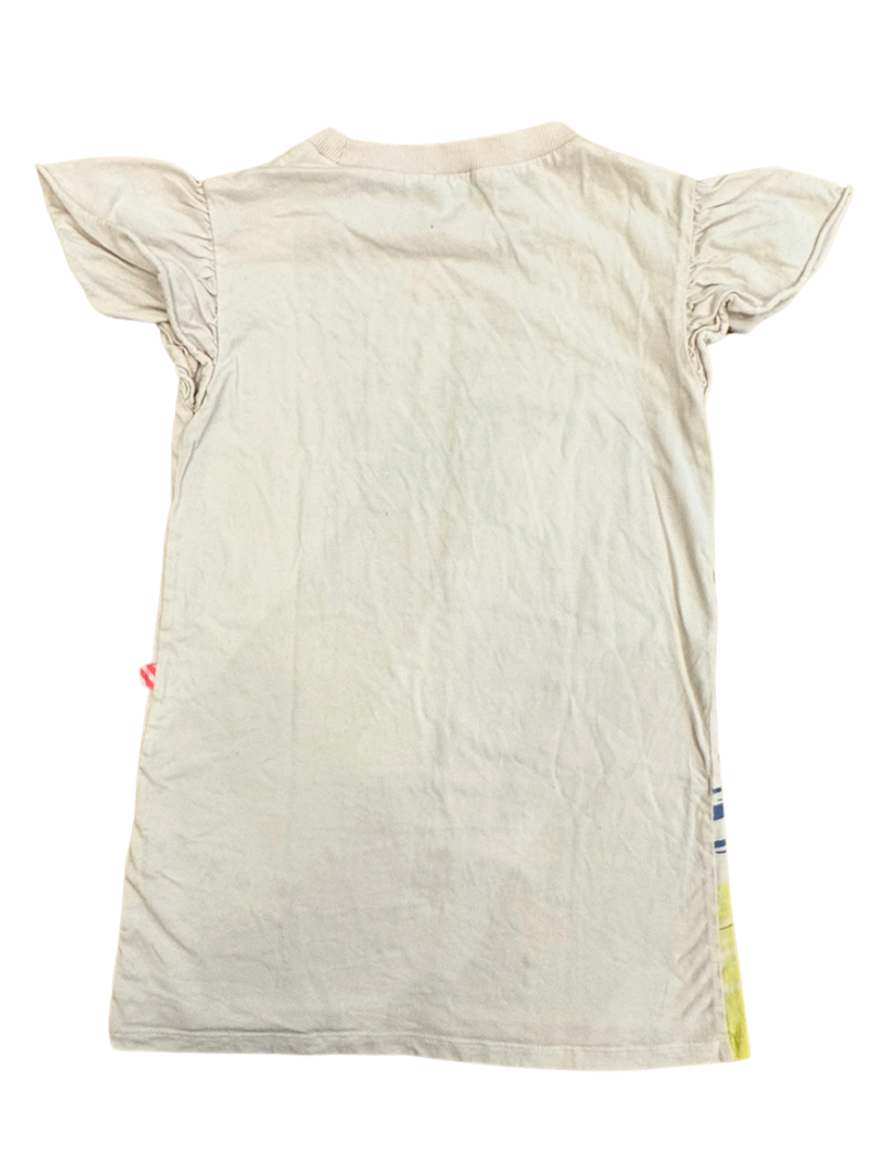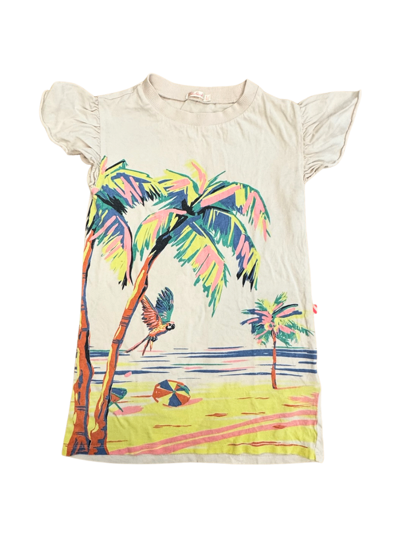 Dieses sommerliche Kleidchen zeigt ein lebendiges Druckdesign mit Palmen, Strand und Vogel. Der lockere Schnitt mit leichten Rüschern an den Ärmeln sorgt für einen verspielten Look. Perfekt für entspannte Tage am Meer oder als trendiges Basic im Alltag.
