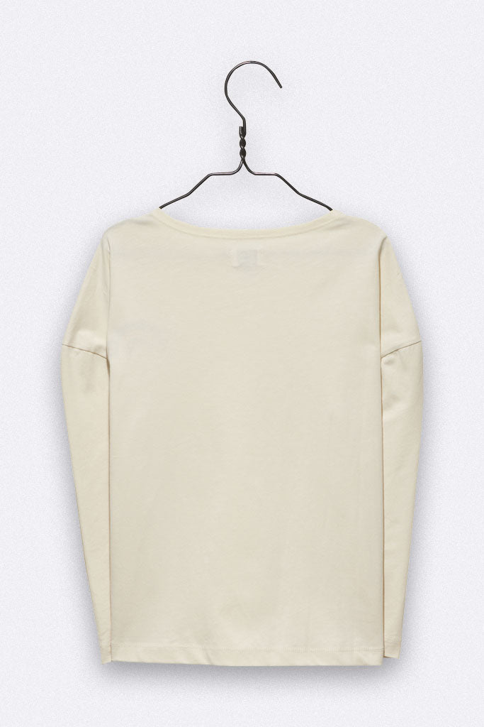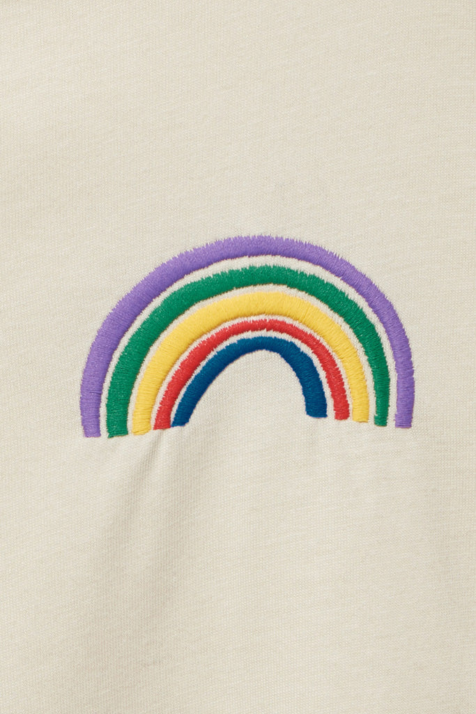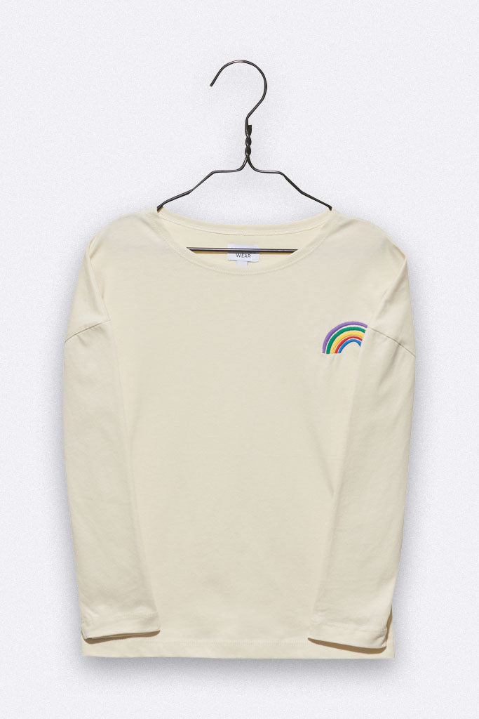 Das Toni longsleeve ist ein weit geschnittenes longsleeve mit niedrig angesetzter Schulter. Es ist aus beigenem Bio-Baumwoll Jersey gefertigt und hat eine kleine Regenbogen Stickerei auf der Brust.