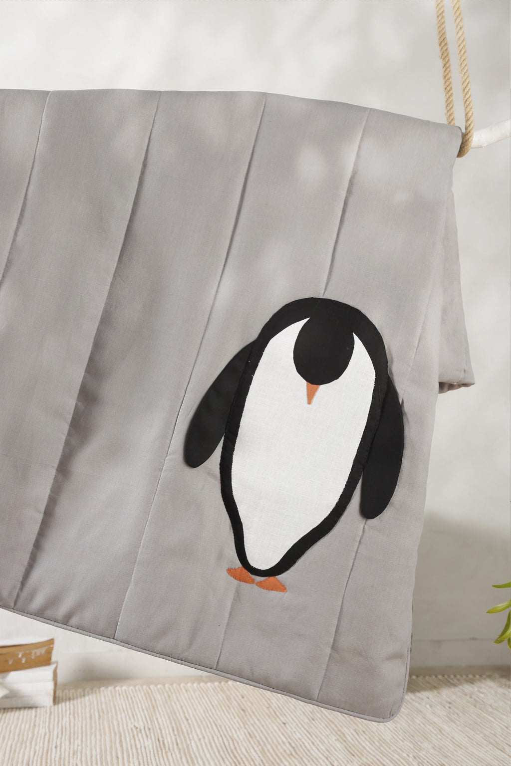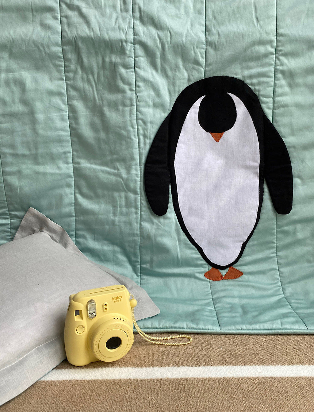 Die Pinguin-Bettdecke ist mit einem großen Pinguin-Motiv auf 100% Leinenstoff handgestickt. Die Arme des Pinguinmotivs sind 3-dimensional und dynamisch.