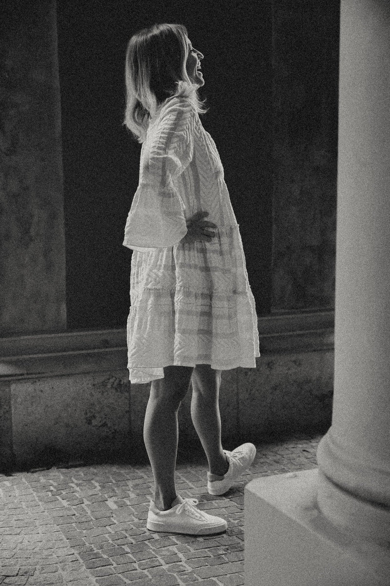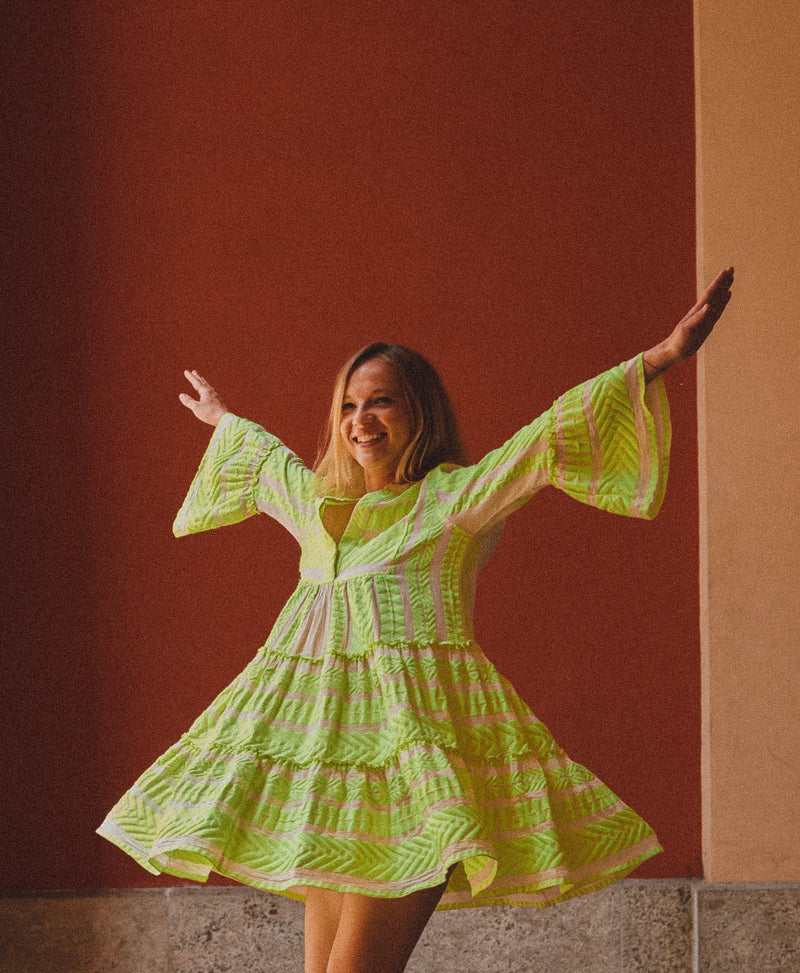 Das Original Ella Dress von Devotion Twins - tu dir den Gefallen und vermeide die Kopien. du wirst es dir danken. 100% Baumwolle kann sich einfach so unterschiedlich anfühlen und gerade die Stoffe die Devotion Twins verwendet rechtfertigen den doch stolzen Preis. Mit dem Lime Beige/Ecru farbenen Mini Ella Dress ist dein Bauch zwar inkognito aber du wirst definitiv trotzdem auffallen. Enjoy!