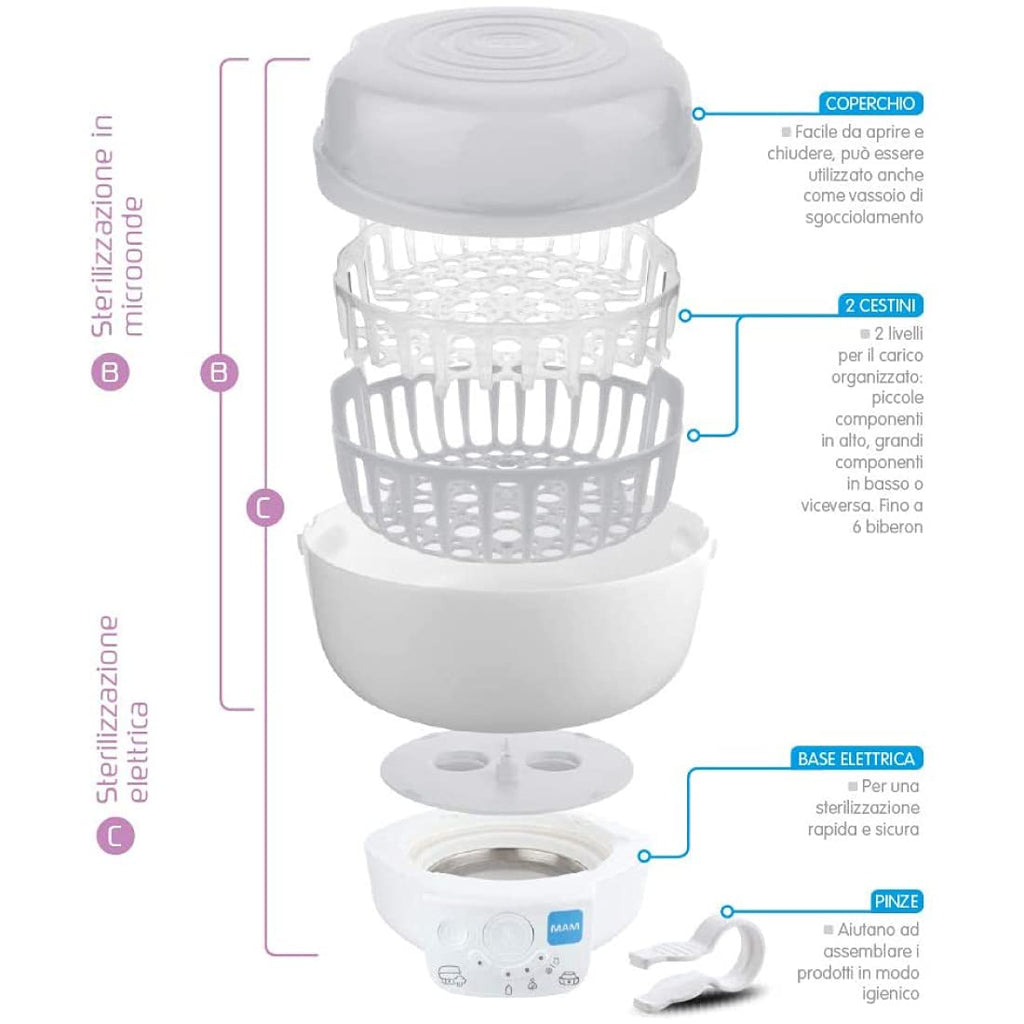 MAM Elektrischer Sterilisator und Flaschenwärmer Express mit Zubehör – Unverzichtbar hat 6 innovative Funktionen in einem Gerät: zum einen ermöglicht es Ihnen, Fläschchen, Schnuller und kleine Gegenstände zu sterilisieren, andererseits ermöglicht es das Aufwärmen von Milch, Auftauen und Aufwärmen von Lebensmitteln und schließlich eine Warmhaltefunktion. MAM Elektrischer Sterilisator und Flaschenwärmer Express hat zudem eine spezielle Funktion zum Auftauen und Aufwärmen wertvoller Muttermilch in angemessener Weise. Dampfsterilisation kann in der Mikrowelle oder über Strom erfolgen. Sterilisiert ab 5 Minuten und hält Gegenstände bis zu 48 Stunden sterilisiert. MAM Elektrischer Sterilisator und Flaschenwärmer Express fasst bis zu 6 MAM Flaschen und 5 Schnuller. Im Lieferumfang enthalten sind außerdem nützliches Zubehör: 1 x Mam Easy Start Anti-Colic Fläschchen 160 ml, mit Anti-Kolik-System für einen reibungslosen Fluss und 1 x MAM Start Schnuller 0-2 Monate, speziell für Neugeborene entwickelt. Produktdetails: Sterilisator und Flaschenwärmer 6in1 Sterilisierbar ab 5 Minuten bis 6 Flaschen und 5 Schnuller mit Warmhalte- und Auftaufunktion mit spezifischer Funktion für Muttermilch Inklusive 1 x MAM Easy Start Anti-Colic Flasche 160ml und 1 x MAM START Schnuller geeignet für 0-2 Monate Farbe: grau 1x Sterilisator Elektrisch 1 x Heizkörper Express-Baby; 1x Fläschchen; 1x Schnuller; 1x Bedienungsanleitung auf Italienisch