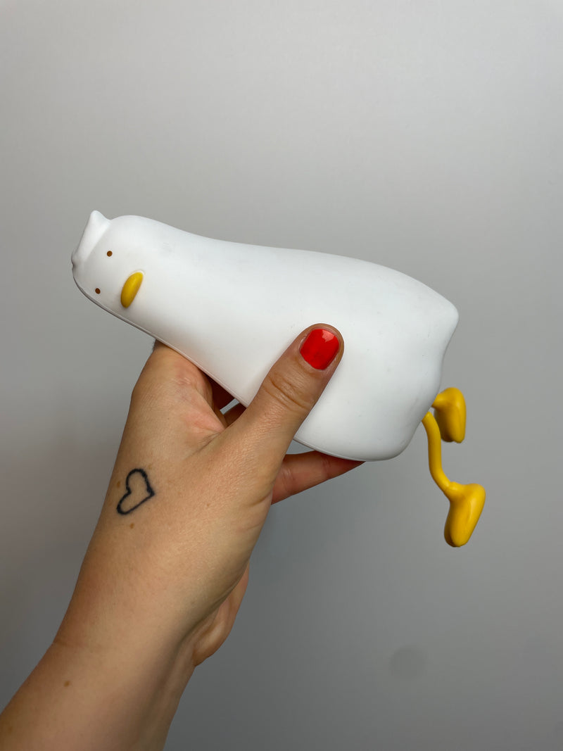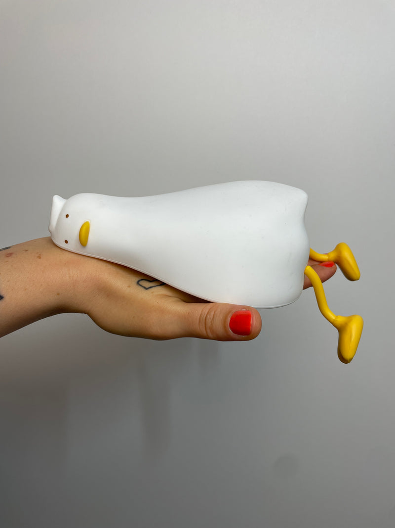 Nachttischlampe in Form einer liegenden, faulen Ente. Eine originelle Art, um in Kinderzimmern zur Schlafenszeit ein beruhigendes, sanftes Licht zu erzeugen.
